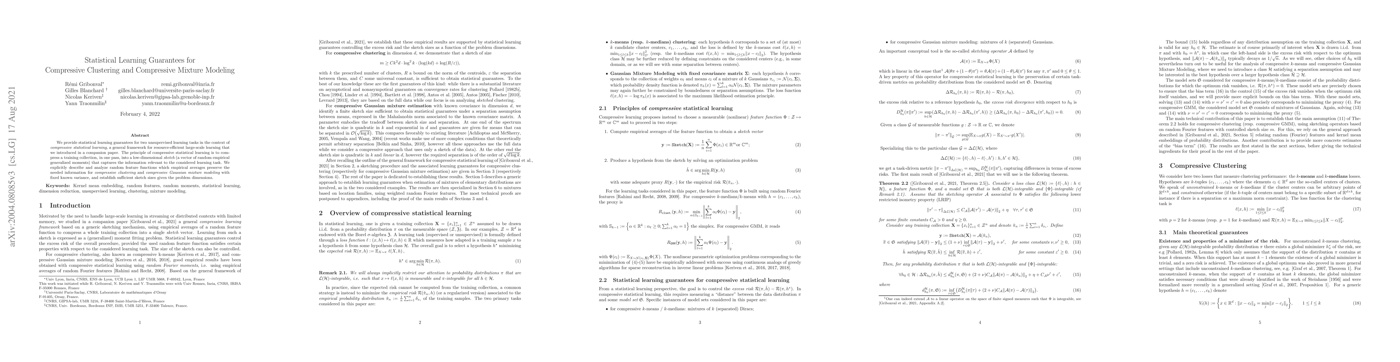 This paper offers statistical learning guarantees for compressive clustering and compressive mixture modeling within the framework of compressive statistical learning, which compresses training data into a low-dimensional sketch to efficiently handle large-scale learning tasks. It analyzes random feature functions that preserve necessary information for these tasks and determines sufficient sketch sizes for effective performance.