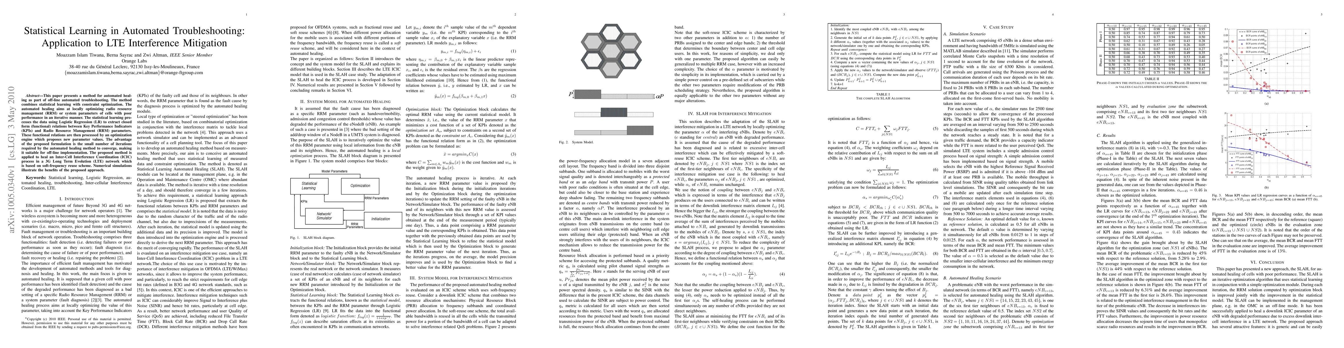 This paper presents a method that uses statistical learning to optimize LTE network performance by automatically adjusting radio resource management parameters. It successfully applies this approach to mitigate interference in 3G networks.