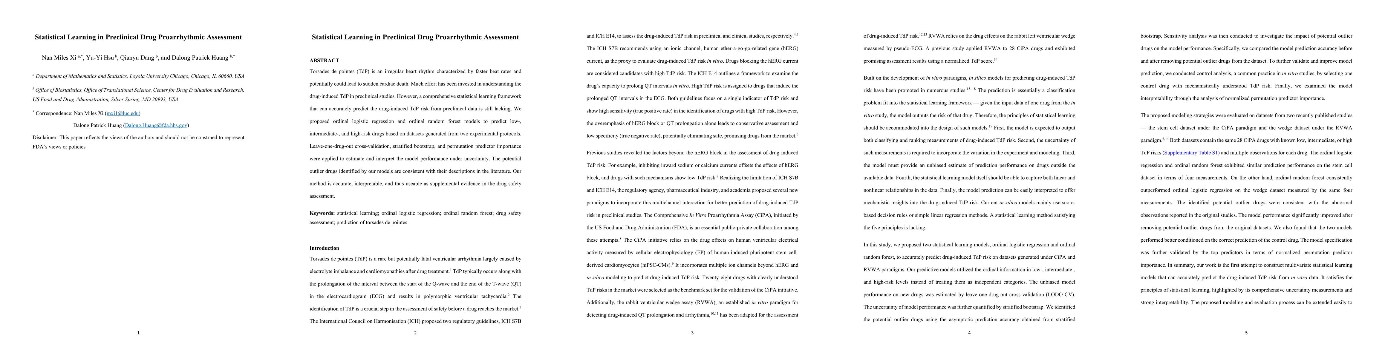 Torsades de pointes (TdP) is an irregular heart rhythm characterized by faster beat rates and potentially could lead to sudden cardiac death. Much effort has been invested in understanding the drug-induced TdP in preclinical studies. However, a comprehensive statistical learning framework that can accurately predict the drug-induced TdP risk from preclinical data is still lacking. We proposed ordinal logistic regression and ordinal random forest models to predict low-, intermediate-, and high-risk drugs based on datasets generated from two experimental protocols. Leave-one-drug-out cross-validation, stratified bootstrap, and permutation predictor importance were applied to estimate and interpret the model performance under uncertainty. The potential outlier drugs identified by our models are consistent with their descriptions in the literature. Our method is accurate, interpretable, and thus useable as supplemental evidence in the drug safety assessment.