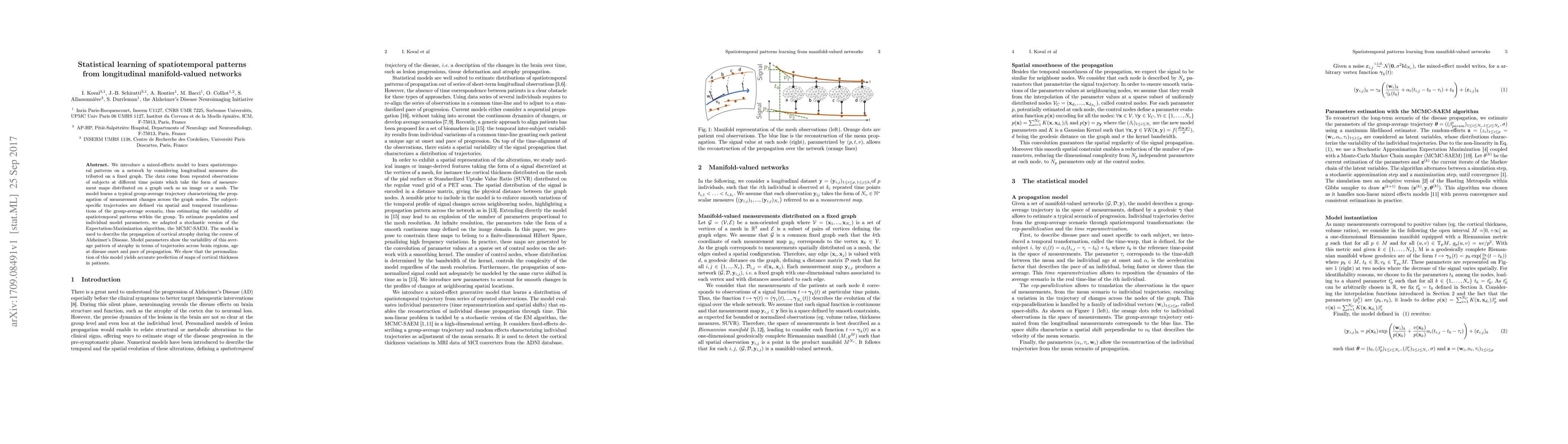 We introduce a mixed-effects model to learn spatiotempo-ral patterns on a network by considering longitudinal measures distributed on a fixed graph. The data come from repeated observations of subjects at different time points which take the form of measurement maps distributed on a graph such as an image or a mesh. The model learns a typical group-average trajectory characterizing the propagation of measurement changes across the graph nodes. The subject-specific trajectories are defined via spatial and temporal transformations of the group-average scenario, thus estimating the variability of spatiotemporal patterns within the group. To estimate population and individual model parameters, we adapted a stochastic version of the Expectation-Maximization algorithm, the MCMC-SAEM. The model is used to describe the propagation of cortical atrophy during the course of Alzheimer's Disease. Model parameters show the variability of this average pattern of atrophy in terms of trajectories across brain regions, age at disease onset and pace of propagation. We show that the personalization of this model yields accurate prediction of maps of cortical thickness in patients.