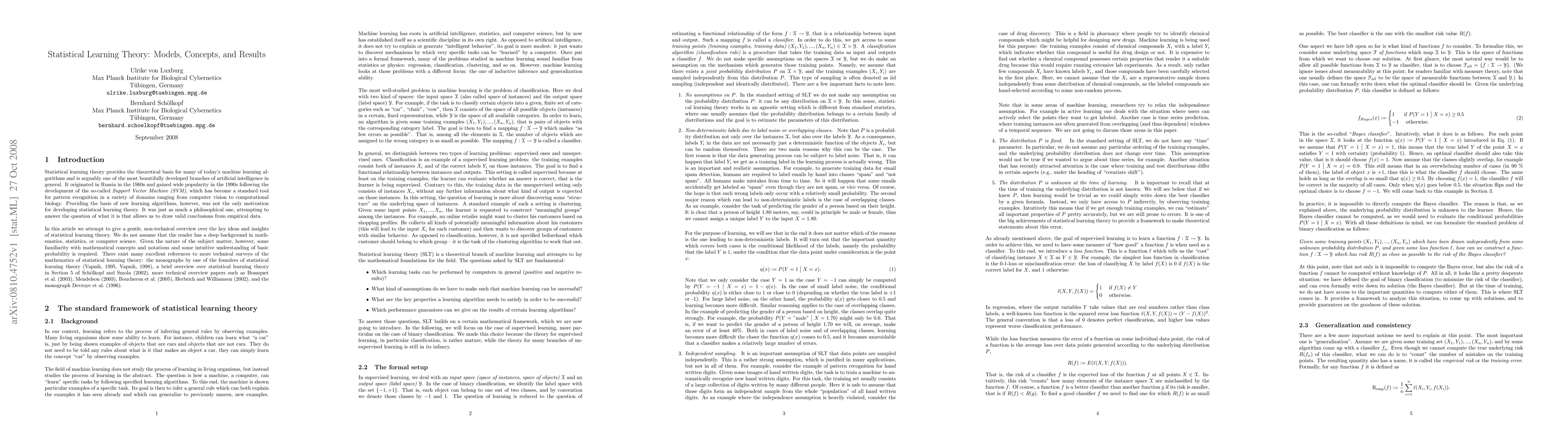 Statistical learning theory provides the theoretical basis for many of today's machine learning algorithms. In this article we attempt to give a gentle, non-technical overview over the key ideas and insights of statistical learning theory. We target at a broad audience, not necessarily machine learning researchers. This paper can serve as a starting point for people who want to get an overview on the field before diving into technical details.