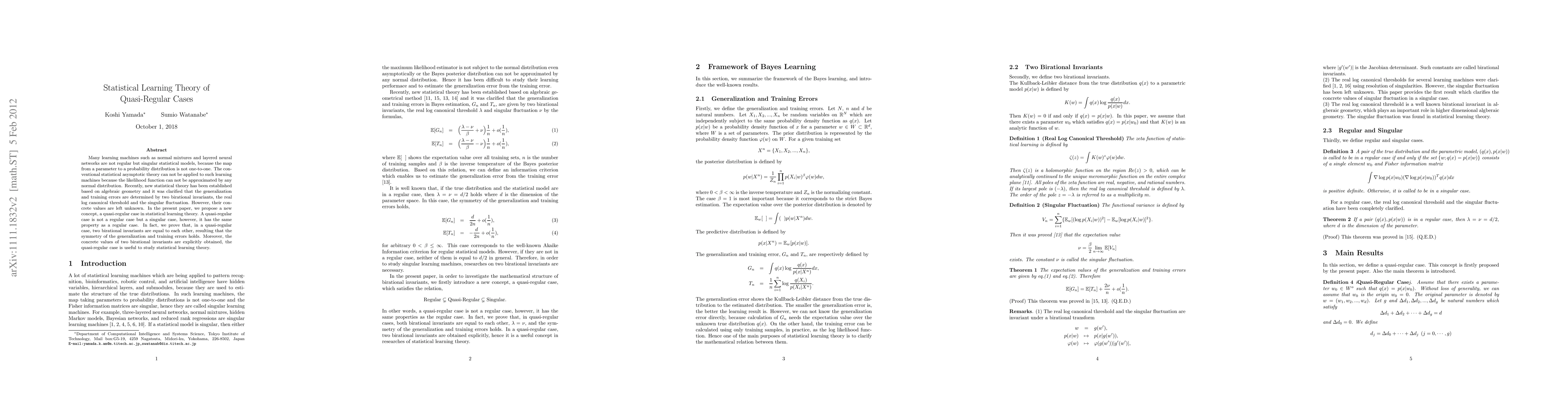 Many learning machines such as normal mixtures and layered neural networks are not regular but singular statistical models, because the map from a parameter to a probability distribution is not one-to-one. The conventional statistical asymptotic theory can not be applied to such learning machines because the likelihood function can not be approximated by any normal distribution. Recently, new statistical theory has been established based on algebraic geometry and it was clarified that the generalization and training errors are determined by two birational invariants, the real log canonical threshold and the singular fluctuation. However, their concrete values are left unknown. In the present paper, we propose a new concept, a quasi-regular case in statistical learning theory. A quasi-regular case is not a regular case but a singular case, however, it has the same property as a regular case. In fact, we prove that, in a quasi-regular case, two birational invariants are equal to each other, resulting that the symmetry of the generalization and training errors holds. Moreover, the concrete values of two birational invariants are explicitly obtained, the quasi-regular case is useful to study statistical learning theory.