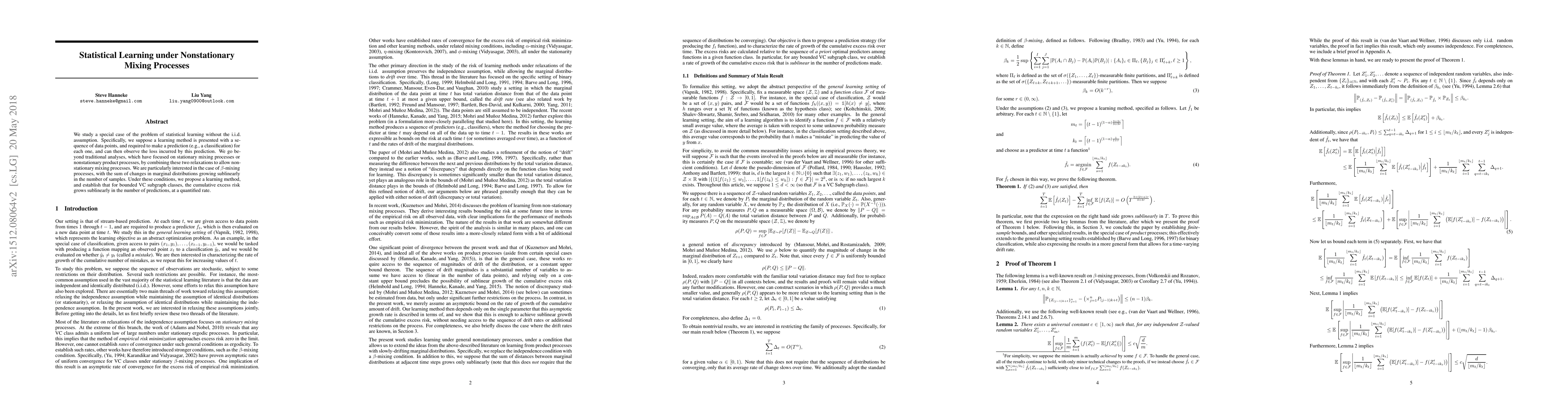The paper studies statistical learning without the i.i.d. assumption, focusing on nonstationary mixing processes, specifically $eta$-mixing processes with sublinearly growing changes in marginal distributions.