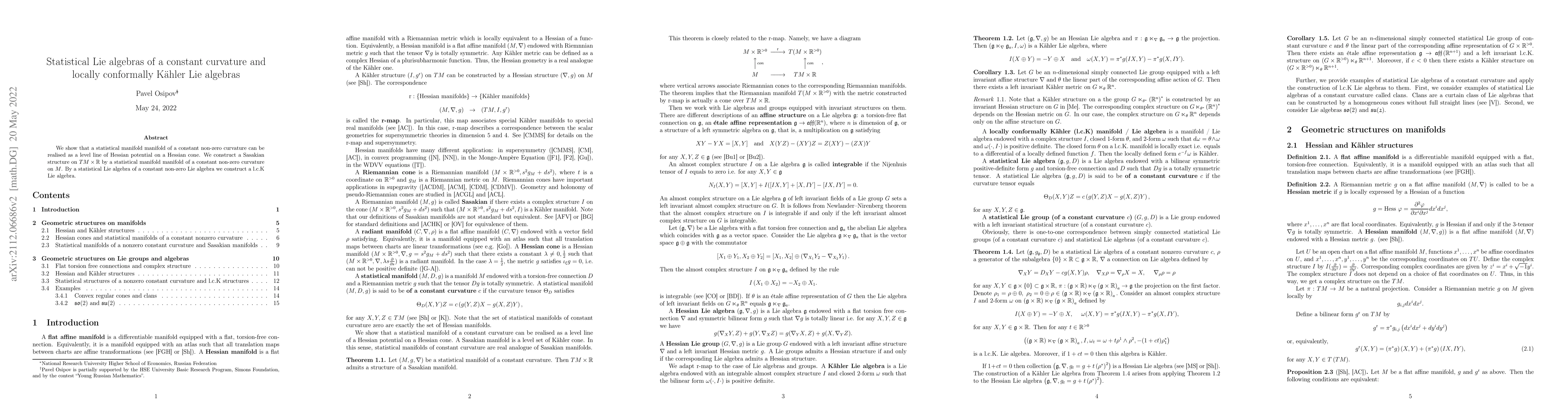We show that a statistical manifold manifold of a constant non-zero curvature can be realised as a level line of Hessian potential on a Hessian cone. We construct a Sasakian structure on $TM\times\R$ by a statistical manifold manifold of a constant non-zero curvature on $M$. By a statistical Lie algebra of a constant non-zero Lie algebra we construct a l.c.K Lie algebra.