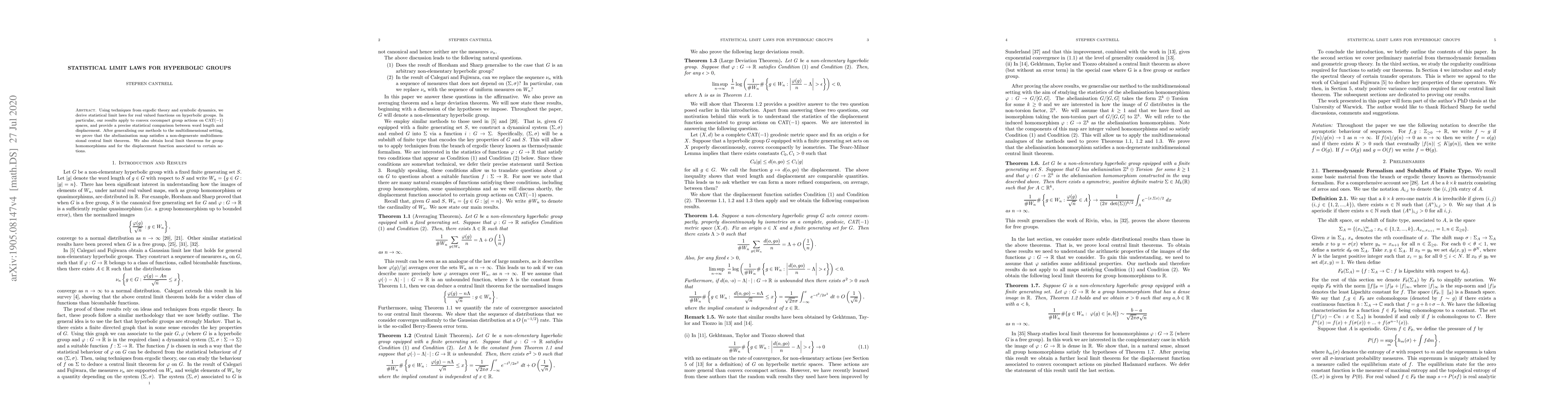 Using techniques from ergodic theory and symbolic dynamics, we derive statistical limit laws for real valued functions on hyperbolic groups. In particular, our results apply to convex cocompact group actions on $\text{CAT}(-1)$ spaces, and provide a precise statistical comparison between word length and displacement. After generalising our methods to the multidimensional setting, we prove that the abelianisation map satisfies a non-degenerate multidimensional central limit theorem. We also obtain local limit theorems for group homomorphisms and for the displacement function associated to certain actions.