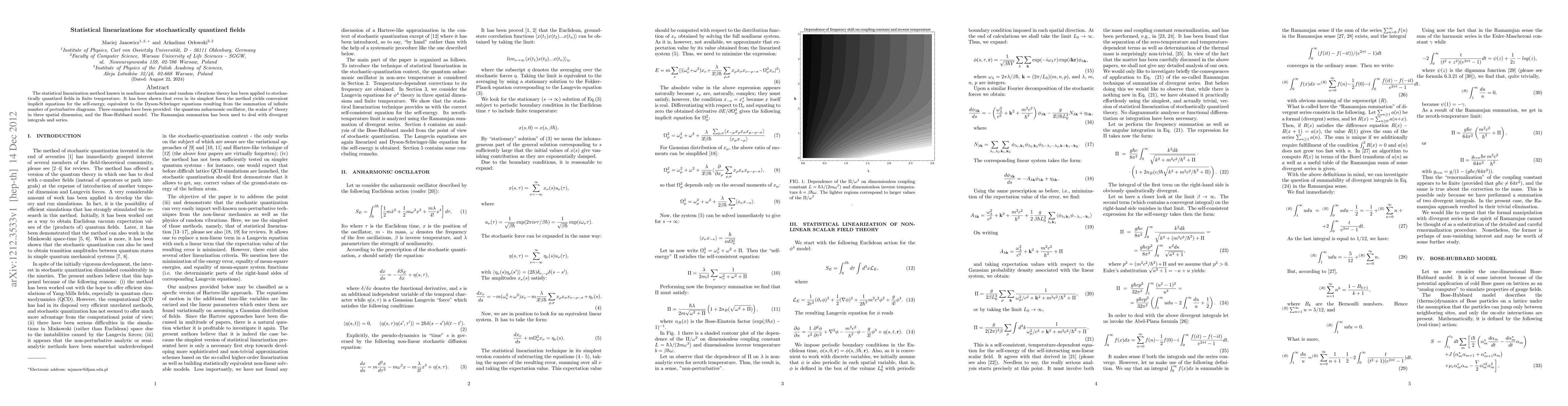 The statistical linearization method known in nonlinear mechanics and random vibrations theory has been applied to stochastically quantized fields in finite temperature. It has been shown that even in its simplest form the method yields convenient implicit equations for the self-energy, equivalent to the Dyson-Schwinger equations resulting from the summation of infinite number of perturbative diagrams. Three examples have been provided: the quantum anharmonic oscillator, the scalar $\phi^{4}$ theory in three spatial dimension, and the Bose-Hubbard model. The Ramanujan summation has been used to deal with divergent integrals and series.