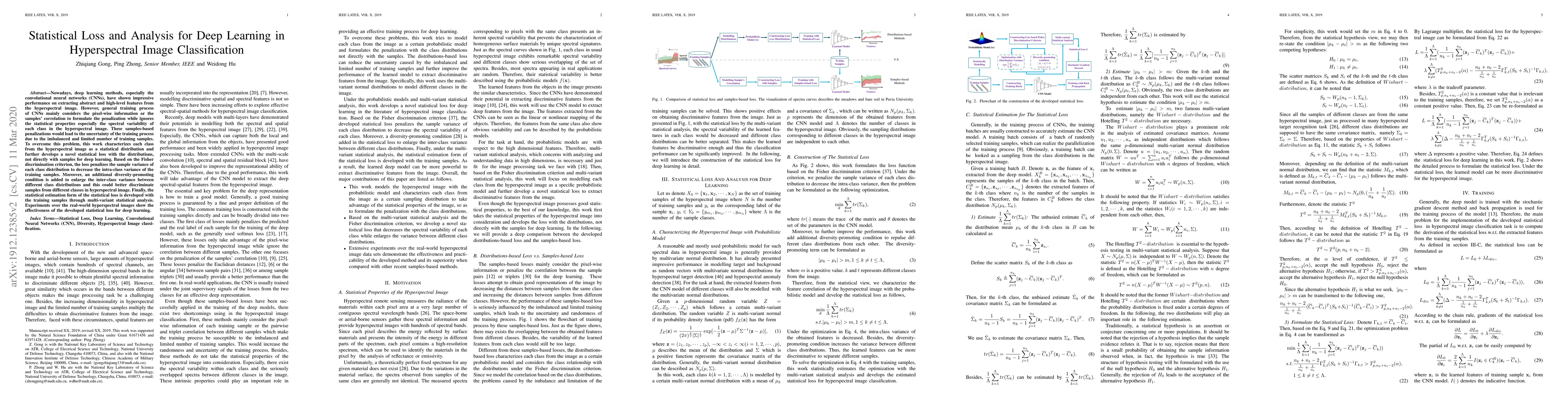 Nowadays, deep learning methods, especially the convolutional neural networks (CNNs), have shown impressive performance on extracting abstract and high-level features from the hyperspectral image. However, general training process of CNNs mainly considers the pixel-wise information or the samples' correlation to formulate the penalization while ignores the statistical properties especially the spectral variability of each class in the hyperspectral image. These samples-based penalizations would lead to the uncertainty of the training process due to the imbalanced and limited number of training samples. To overcome this problem, this work characterizes each class from the hyperspectral image as a statistical distribution and further develops a novel statistical loss with the distributions, not directly with samples for deep learning. Based on the Fisher discrimination criterion, the loss penalizes the sample variance of each class distribution to decrease the intra-class variance of the training samples. Moreover, an additional diversity-promoting condition is added to enlarge the inter-class variance between different class distributions and this could better discriminate samples from different classes in hyperspectral image. Finally, the statistical estimation form of the statistical loss is developed with the training samples through multi-variant statistical analysis. Experiments over the real-world hyperspectral images show the effectiveness of the developed statistical loss for deep learning.