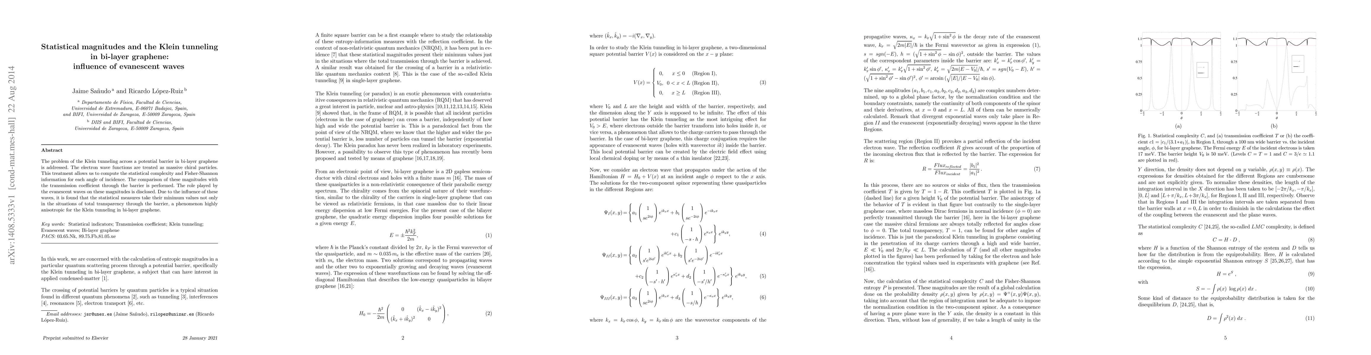 This paper investigates Klein tunneling in bi-layer graphene, analyzing electron wave functions and computing statistical complexity and Fisher-Shannon information. It reveals that evanescent waves influence these statistical measures, which reach minimum values under conditions of total transparency, highlighting anisotropic effects in Klein tunneling.