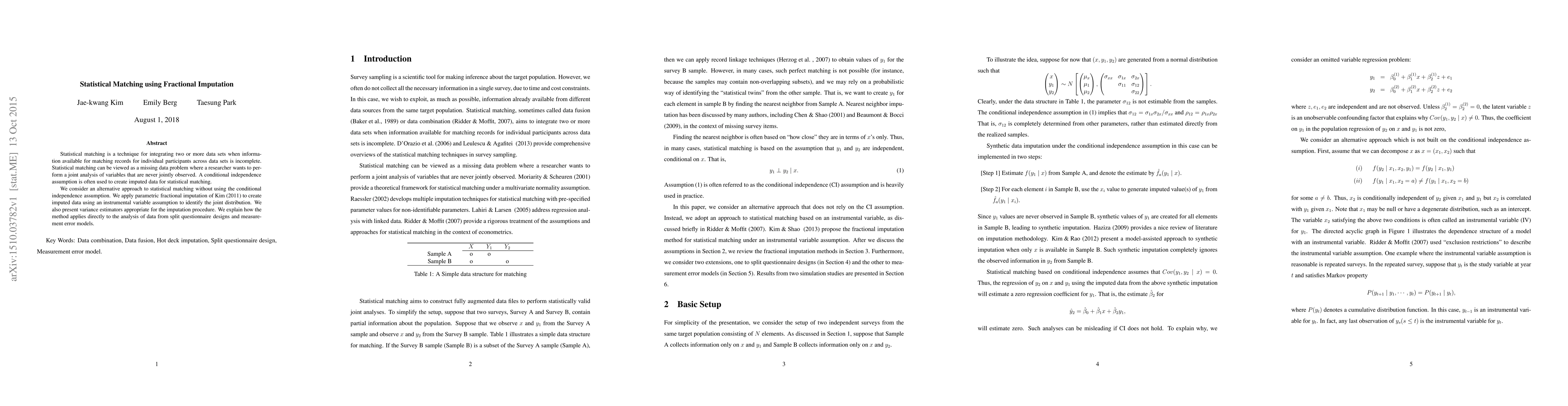 This paper proposes an alternative to traditional statistical matching using fractional imputation without relying on conditional independence assumptions. It applies parametric fractional imputation with an instrumental variable approach to identify the joint distribution, presenting appropriate variance estimators and demonstrating its application to split questionnaire designs and measurement error models.