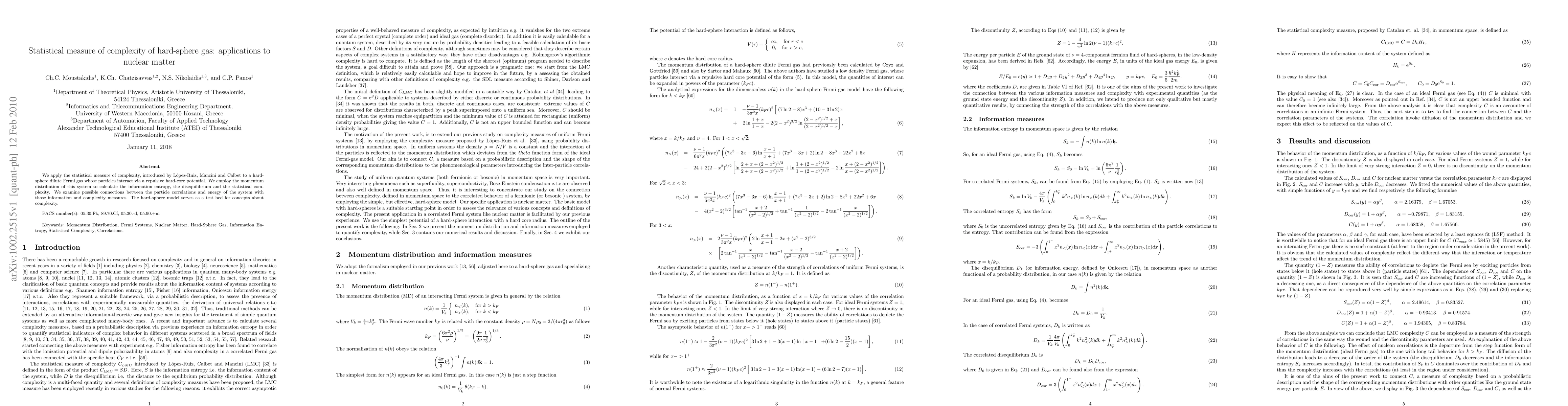 This paper applies a statistical measure of complexity to a hard-sphere dilute Fermi gas, using momentum distribution to calculate information entropy, disequilibrium, and statistical complexity. It explores connections between particle correlations, system energy, and these measures, using the hard-sphere model to test complexity concepts.
