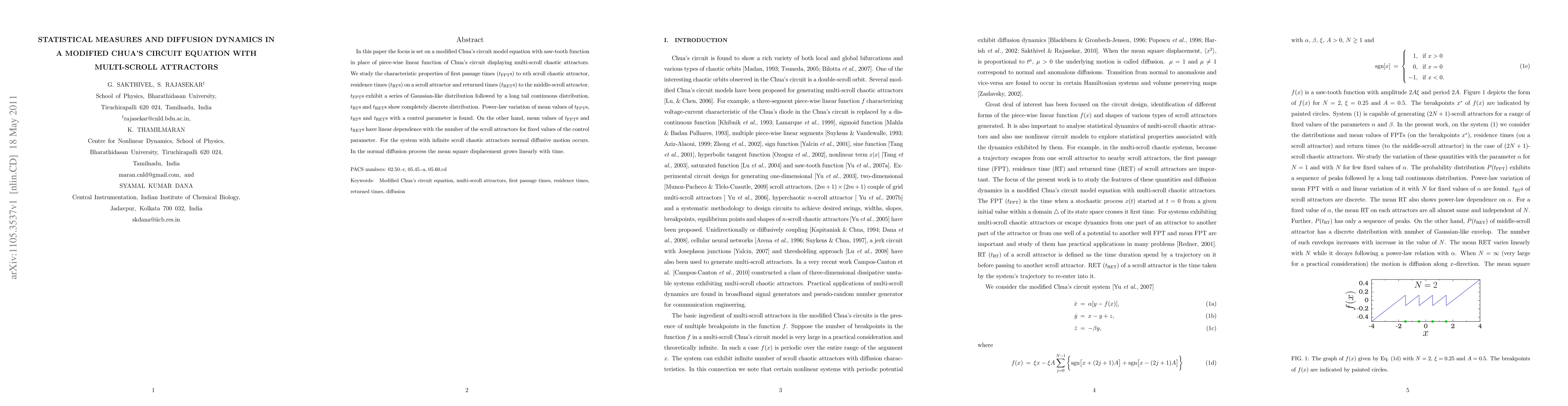 This paper investigates a modified Chua's circuit model with multi-scroll chaotic attractors, analyzing first passage, residence, and return times. It finds Gaussian-like distributions for first passage times and discrete distributions for others, with power-law variations dependent on control parameters.