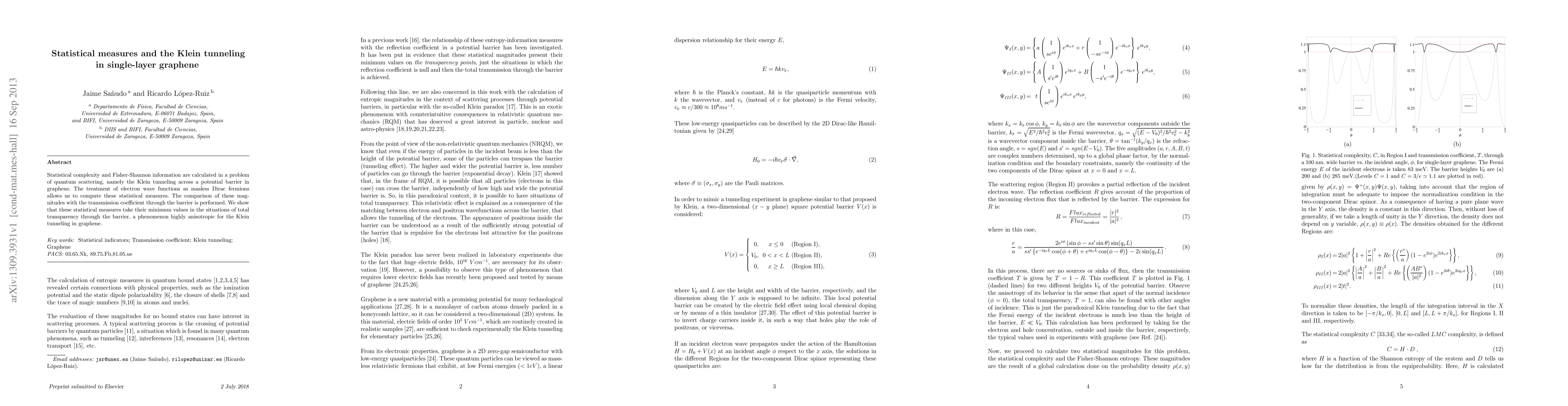 Statistical complexity and Fisher-Shannon information are calculated in a problem of quantum scattering, namely the Klein tunneling across a potential barrier in graphene. The treatment of electron wave functions as masless Dirac fermions allows us to compute these statistical measures. The comparison of these magnitudes with the transmission coefficient through the barrier is performed. We show that these statistical measures take their minimum values in the situations of total transparency through the barrier, a phenomenon highly anisotropic for the Klein tunneling in graphene.