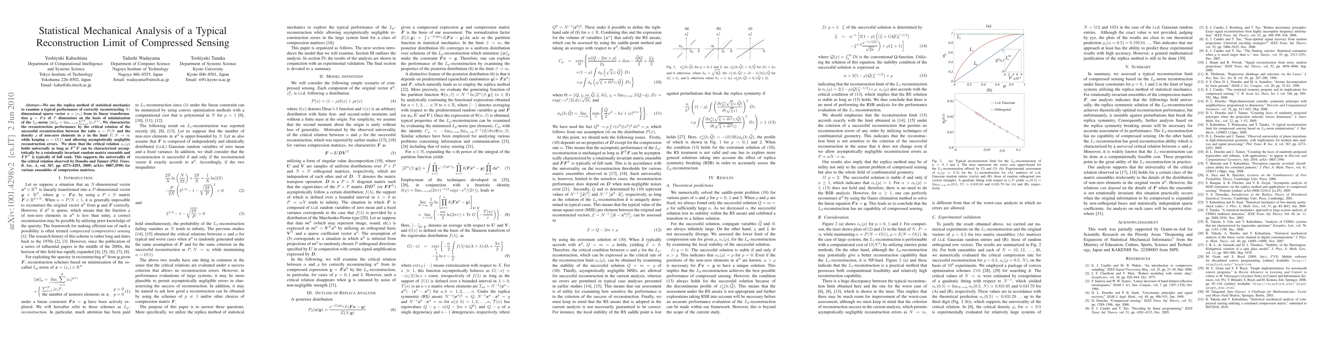 This paper uses statistical mechanics to analyze the typical reconstruction limit in compressed sensing, showing that the critical relation between the ratio of dimensions and the density of non-zero elements holds universally for various compression matrices, supporting the findings of Donoho and Tanner.