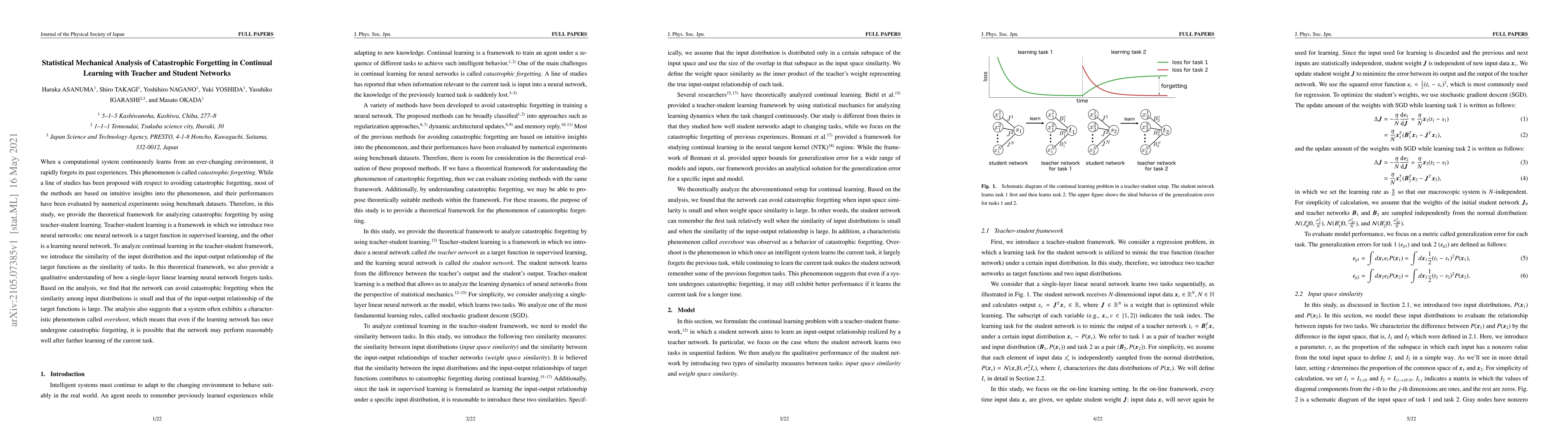 This paper develops a statistical mechanical framework to analyze catastrophic forgetting in continual learning using teacher-student networks. It finds that a learning neural network can avoid forgetting when input distribution similarities are low and input-output relationships are high, and introduces the phenomenon of overshoot where networks recover performance after initial forgetting.