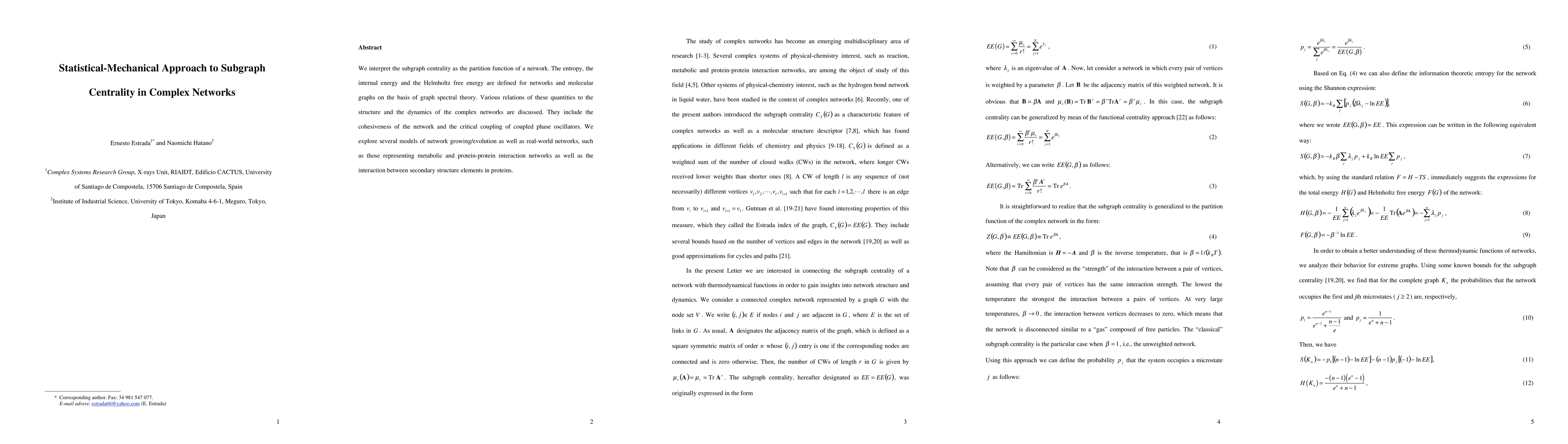 This paper uses statistical mechanics to analyze subgraph centrality in complex networks, exploring relationships between network structure and dynamics, including entropy, internal energy, and Helmholtz free energy.