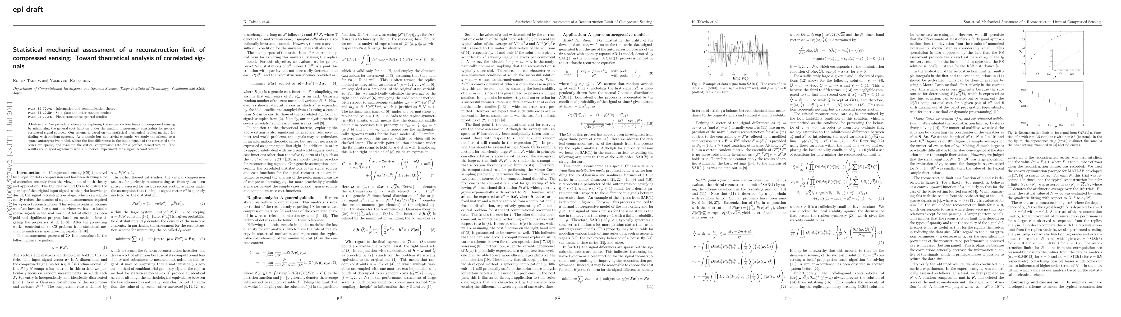 This paper proposes a statistical mechanical approach using the replica method to determine the reconstruction limit of compressed sensing for correlated signals. It applies this method to a sparse autoregressive model and finds the critical compression rate for perfect reconstruction, with results corroborating numerical experiments.