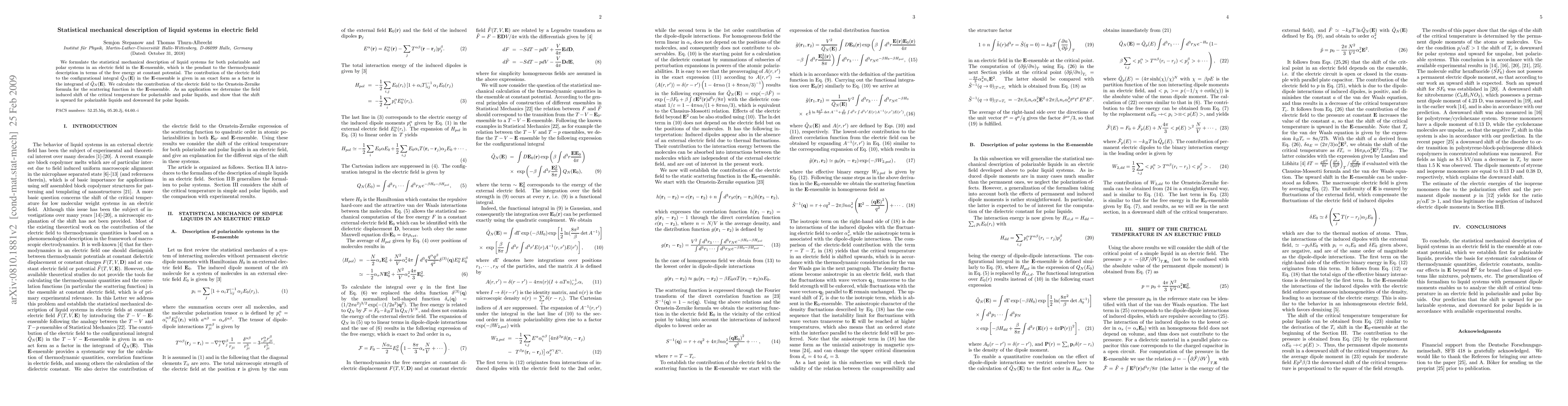 We formulate the statistical mechanical description of liquid systems for both polarizable and polar systems in an electric field in the $\mathbf{E}$-ensemble, which is the pendant to the thermodynamic description in terms of the free energy at constant potential. The contribution of the electric field to the configurational integral $\tilde{Q}_{N}(\mathbf{E})$ in the $\mathbf{E}$-ensemble is given in an exact form as a factor in the integrand of $\tilde{Q}_{N}(\mathbf{E})$. We calculate the contribution of the electric field to the Ornstein-Zernike formula for the scattering function in the $\mathbf{E}$-ensemble. As an application we determine the field induced shift of the critical temperature for polarizable and polar liquids, and show that the shift is upward for polarizable liquids and downward for polar liquids.