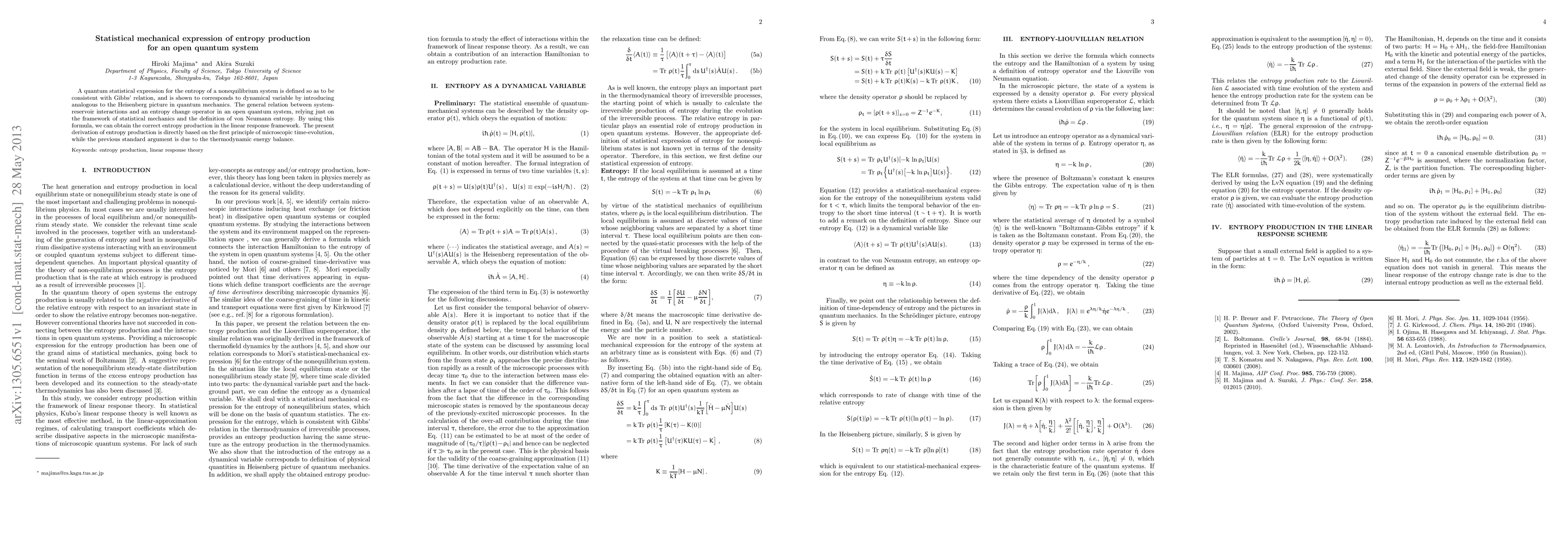 This paper develops a quantum statistical expression for entropy in nonequilibrium systems, consistent with Gibbs' relation, and establishes a connection to system-reservoir interactions using von Neumann entropy. The derived formula for entropy production aligns with the linear response framework based on microscopic time-evolution principles.