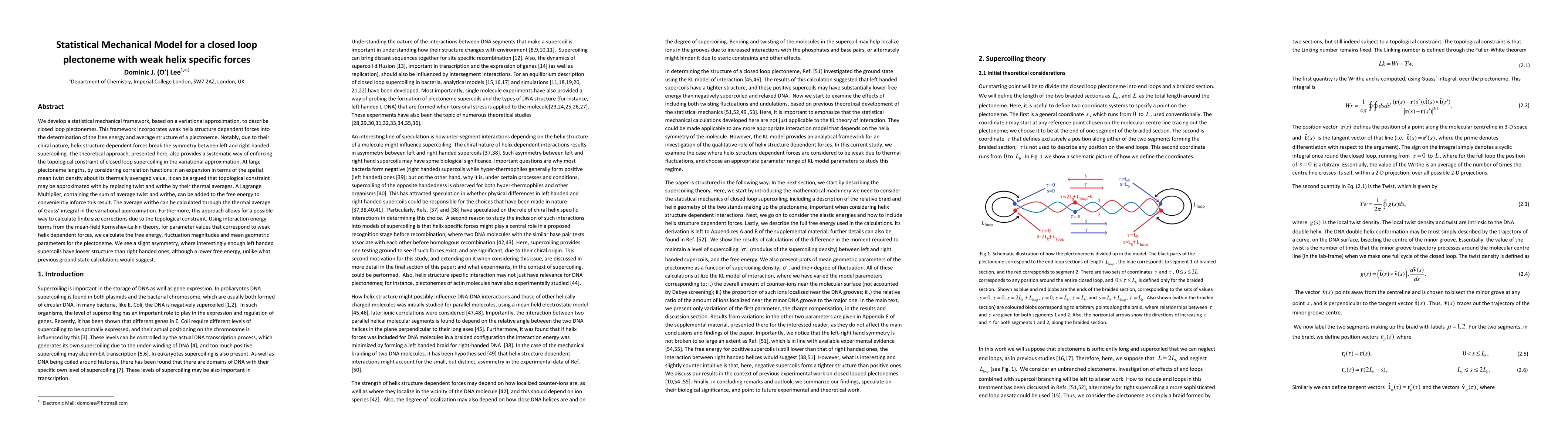 We develop a statistical mechanical framework, based on a variational approximation, to describe closed loop plectonemes. This framework incorporates weak helix structure dependent forces into the determination of the free energy and average structure of a plectoneme. Notably, due to their chiral nature, helix structure dependent forces break the symmetry between left and right handed supercoiling. The theoretical approach, presented here, also provides a systematic way of enforcing the topological constraint of closed loop supercoiling in the variational approximation. At large plectoneme lengths, by considering correlation functions in an expansion in terms of the spatial mean twist density about its thermally averaged value, it can be argued that topological constraint may be approximated with by replacing twist and writhe by their thermal averages. A Lagrange Multiplier, containing the sum of average twist and writhe, can be added to the free energy to conveniently inforce this result. The average writhe can be calculated through the thermal average of Gauss integral in the variational approximation. Furthermore, this approach allows for a possible way to calculate finite size corrections due to the topological constraint. Using interaction energy terms from the mean-field Kornyshev-Leikin theory, for parameter values that correspond to weak helix dependent forces, we calculate the free energy, fluctuation magnitudes and mean geometric parameters for the plectoneme. We see a slight asymmetry, where interestingly enough left handed supercoils have looser structure than right handed ones, although a lower free energy, unlike what previous ground state calculations would suggest.