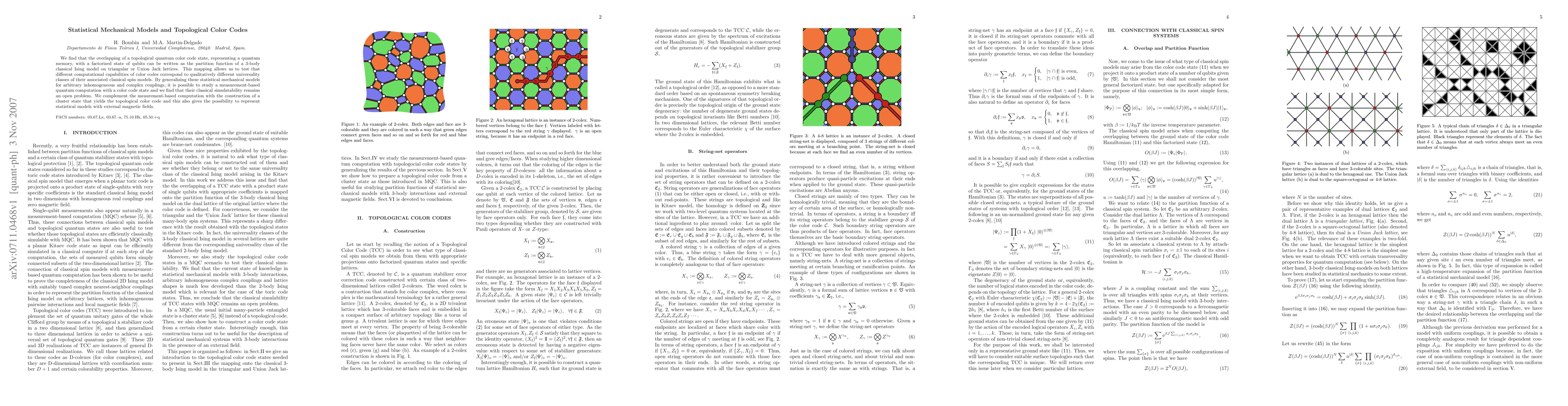 We find that the overlapping of a topological quantum color code state, representing a quantum memory, with a factorized state of qubits can be written as the partition function of a 3-body classical Ising model on triangular or Union Jack lattices. This mapping allows us to test that different computational capabilities of color codes correspond to qualitatively different universality classes of their associated classical spin models. By generalizing these statistical mechanical models for arbitrary inhomogeneous and complex couplings, it is possible to study a measurement-based quantum computation with a color code state and we find that their classical simulatability remains an open problem. We complement the meaurement-based computation with the construction of a cluster state that yields the topological color code and this also gives the possibility to represent statistical models with external magnetic fields.