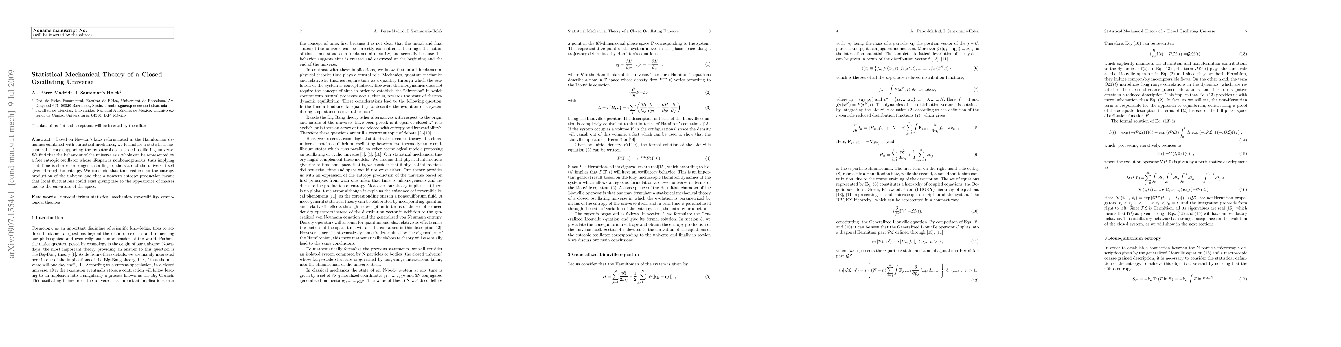 This paper proposes a statistical mechanical theory for a closed oscillating universe, using Hamiltonian dynamics and statistical mechanics. It suggests that the universe behaves like a free entropic oscillator, with time varying according to the universe's entropy, leading to fluctuations that create masses and space curvature.
