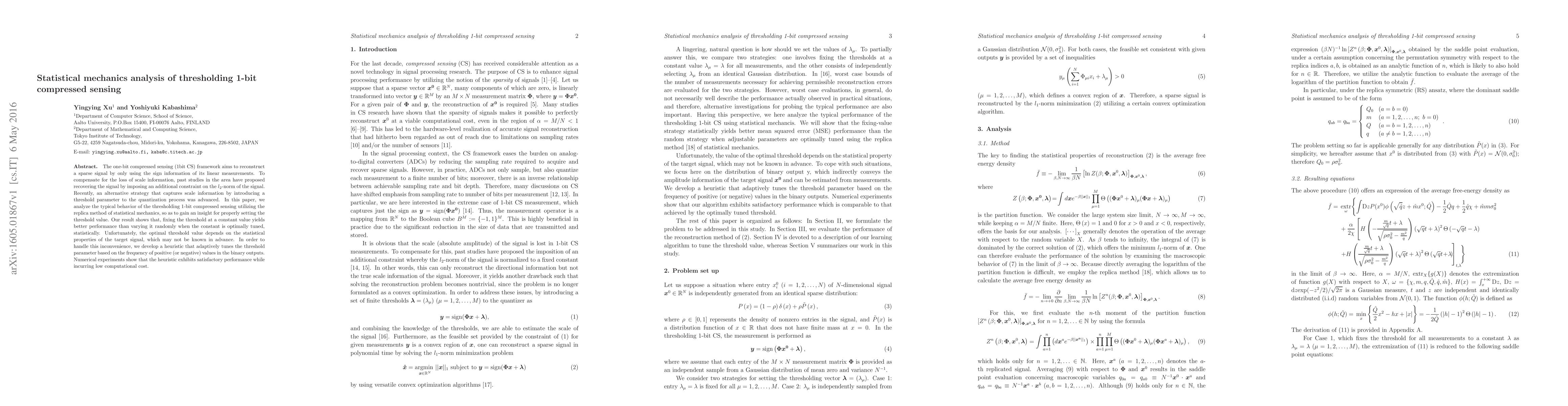 This paper analyzes the performance of thresholding 1-bit compressed sensing using statistical mechanics, finding that a fixed, optimally tuned threshold outperforms a randomly varying one. To address the lack of prior knowledge of optimal threshold values, the authors propose a heuristic adaptively adjusting the threshold based on the frequency of binary outputs, which performs well with low computational cost.