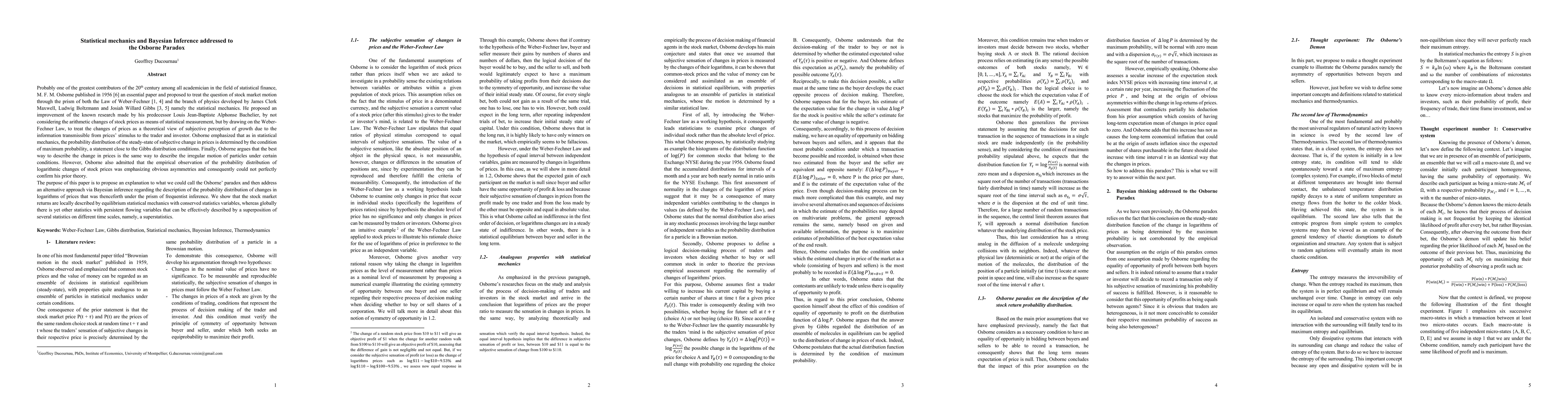 One of the greatest contributors of the 20th century among all academician in the field of statistical finance, M. F. M. Osborne published in 1956 [6] an essential paper and proposed to treat the question of stock market motion through the prism of both the Law of Weber-Fechner [1, 4] and the branch of physics developed by James Clerk Maxwell, Ludwig Boltzmann and Josiah Willard Gibbs [3, 5] namely the statistical mechanics. He proposed an improvement of the known research made by his predecessor Louis Jean-Baptiste Alphonse Bachelier, by not considering the arithmetic changes of stock prices as means of statistical measurement, but by drawing on the Weber-Fechner Law, to treat the changes of prices. Osborne emphasized that as in statistical mechanics, the probability distribution of the steady-state of subjective change in prices is determined by the condition of maximum probability, a statement close to the Gibbs distribution conditions. However, Osborne also admitted that the empirical observation of the probability distribution of logarithmic changes of stock prices was emphasizing obvious asymmetries and consequently could not perfectly confirm his prior theory. The purpose of this paper is to propose an explanation to what we could call the Osborne paradox and then address an alternative approach via Bayesian inference regarding the description of the probability distribution of changes in logarithms of prices that was thenceforth under the prism of frequentist inference. We show that the stock market returns are locally described by equilibrium statistical mechanics with conserved statistics variables, whereas globally there is yet other statistics with persistent flowing variables that can be effectively described by a superposition of several statistics on different time scales, namely, a superstatistics.