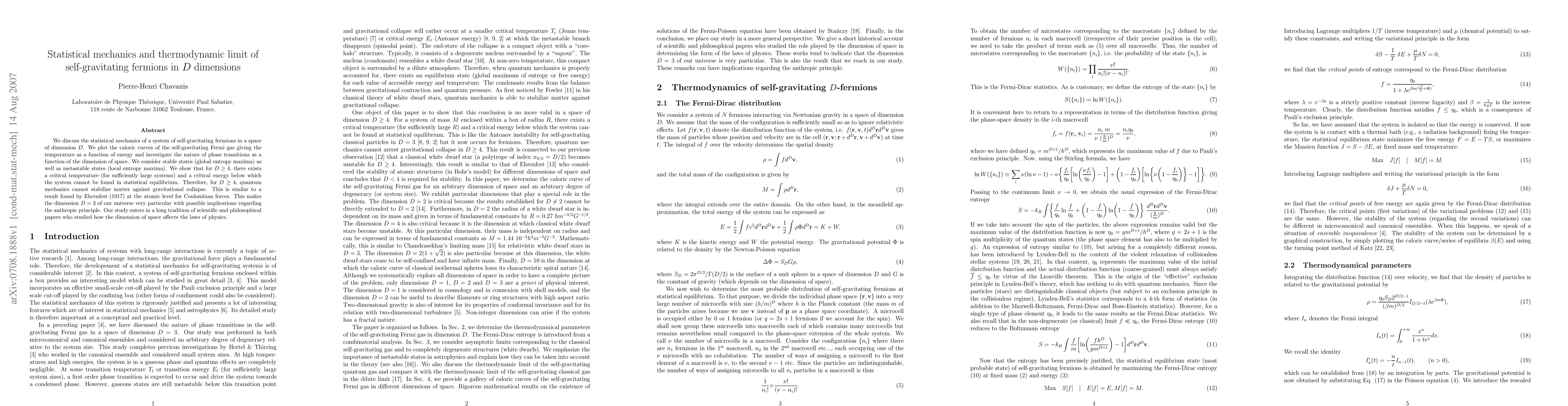 This paper investigates the statistical mechanics of self-gravitating fermions in $D$ dimensions, revealing that for $D\ge 4$, there is a critical temperature and energy below which the system cannot reach equilibrium, leading to gravitational collapse. This suggests a unique role for $D=3$ in preventing collapse, with implications for the anthropic principle.