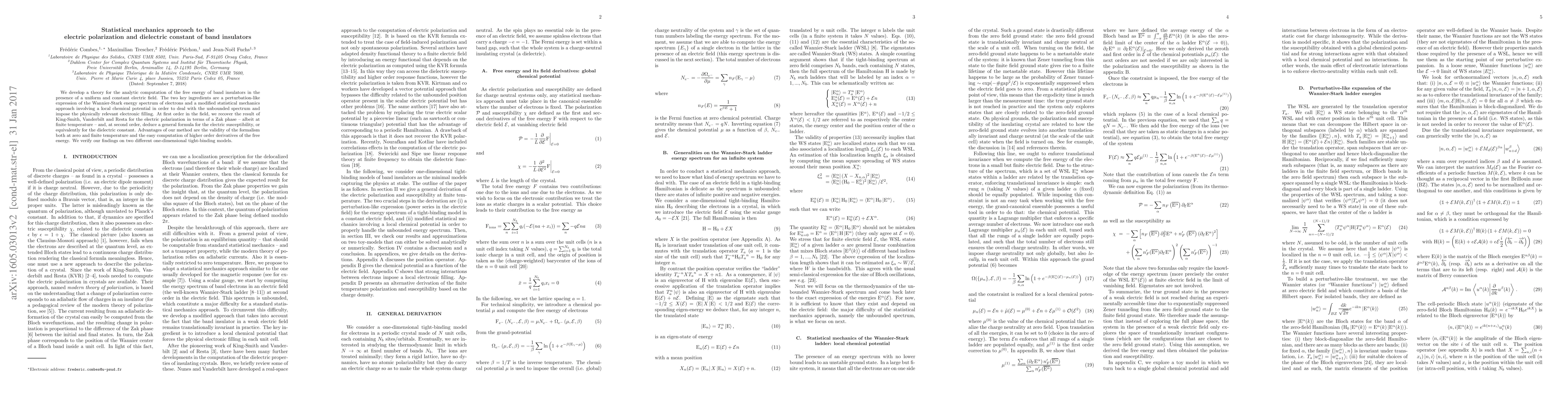 This paper develops a statistical mechanics theory to compute the free energy of band insulators under an electric field, using a perturbation-like Wannier-Stark spectrum and a modified approach with local chemical potential. The method yields results for electric polarization and dielectric constant, valid at both zero and finite temperatures.