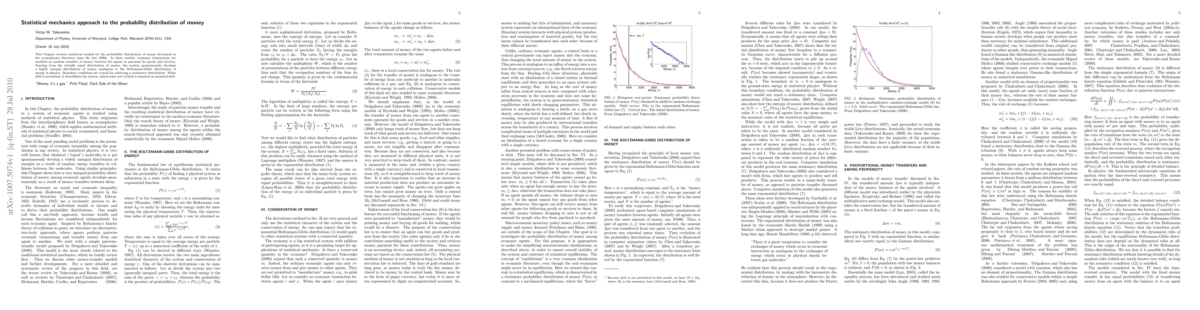 This Chapter reviews statistical models for the probability distribution of money developed in the econophysics literature since the late 1990s. In these models, economic transactions are modeled as random transfers of money between the agents in payment for goods and services. Starting from the initially equal distribution of money, the system spontaneously develops a highly unequal distribution of money analogous to the Boltzmann-Gibbs distribution of energy in physics. Boundary conditions are crucial for achieving a stationary distribution. When debt is permitted, it destabilizes the system, unless some sort of limit is imposed on maximal debt.
