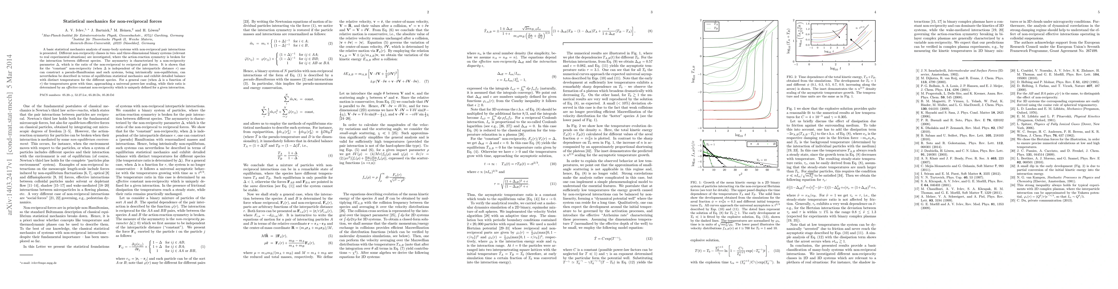 This paper presents a statistical mechanics analysis of many-body systems with non-reciprocal interactions, showing that systems with constant non-reciprocity can be described using equilibrium statistical mechanics despite being non-equilibrium. For variable non-reciprocity, temperatures evolve over time following a universal power-law scaling.