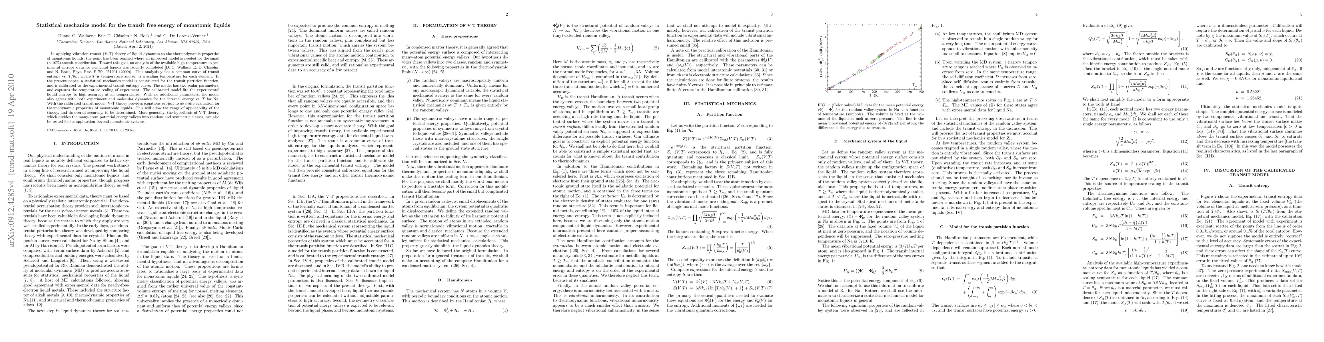 This paper develops a statistical mechanics model for the transit free energy of monatomic liquids, calibrated against high-temperature experimental entropy data, and shows high accuracy in fitting liquid entropy and internal energy. The model supports the Vibration-Transit theory and allows for ab initio evaluation of thermodynamic properties.