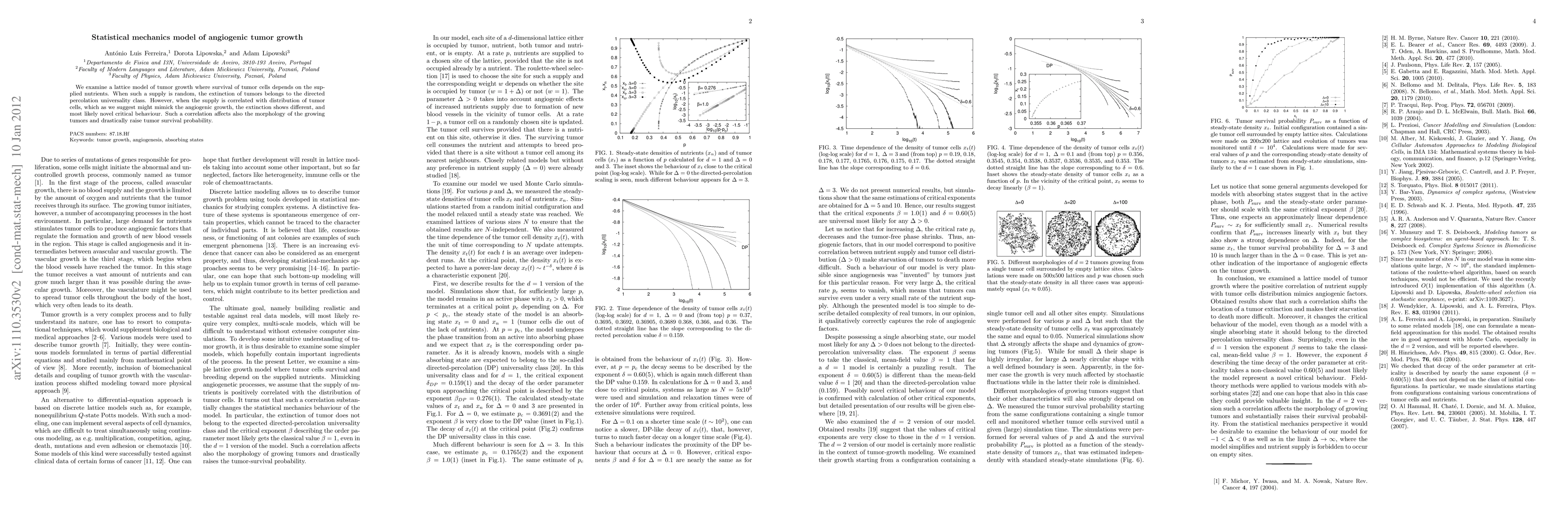 We examine a lattice model of tumor growth where survival of tumor cells depends on the supplied nutrients. When such a supply is random, the extinction of tumors belongs to the directed percolation universality class. However, when the supply is correlated with distribution of tumor cells, which as we suggest might mimick the angiogenic growth, the extinction shows different, and most likely novel critical behaviour. Such a correlation affects also the morphology of the growing tumors and drastically raise tumor survival probability.