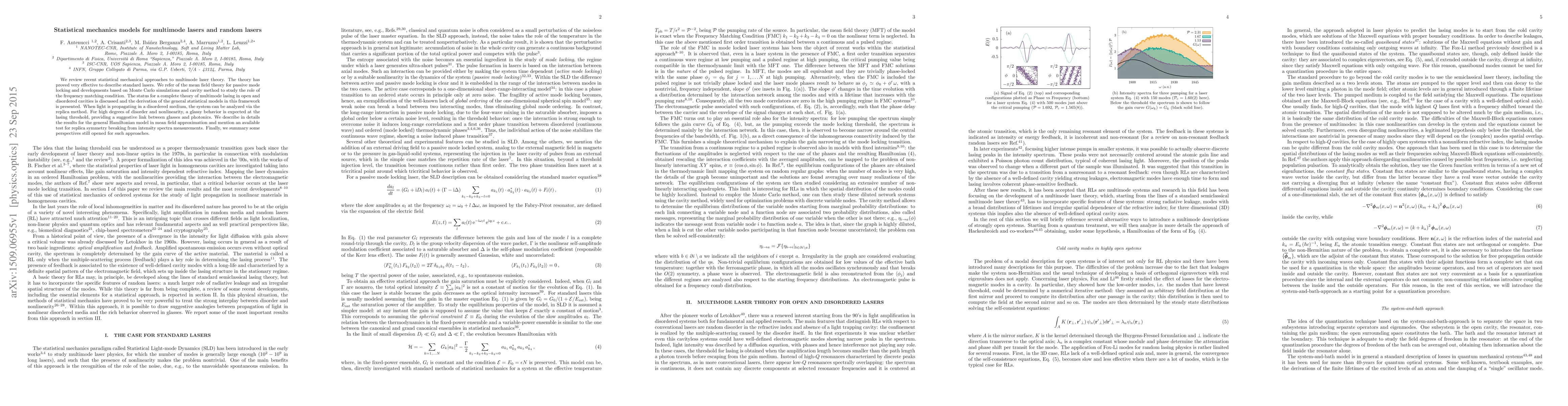 This paper reviews recent statistical mechanical models for multimode lasers, emphasizing mean field theory, Monte Carlo simulations, and cavity methods. It discusses the potential for glassy behavior in disordered photonic systems and outlines future research directions.