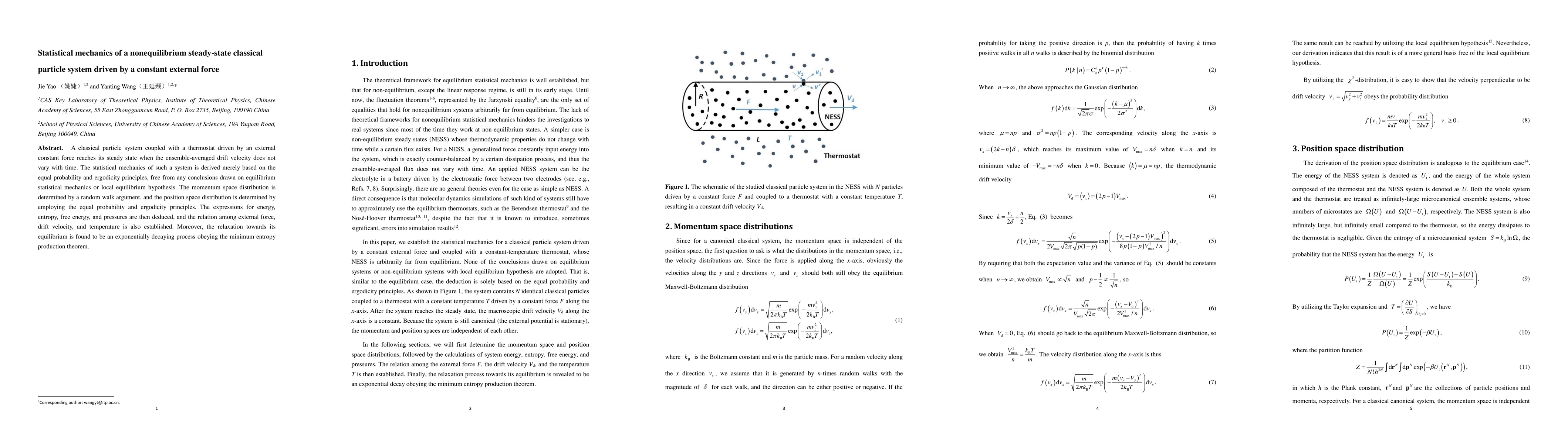 This paper derives the statistical mechanics of a nonequilibrium steady-state classical particle system driven by a constant external force, establishing expressions for energy, entropy, and free energy based on equal probability and ergodicity principles, without relying on equilibrium assumptions. The system's relaxation towards equilibrium is shown to follow an exponentially decaying process governed by the minimum entropy production theorem.
