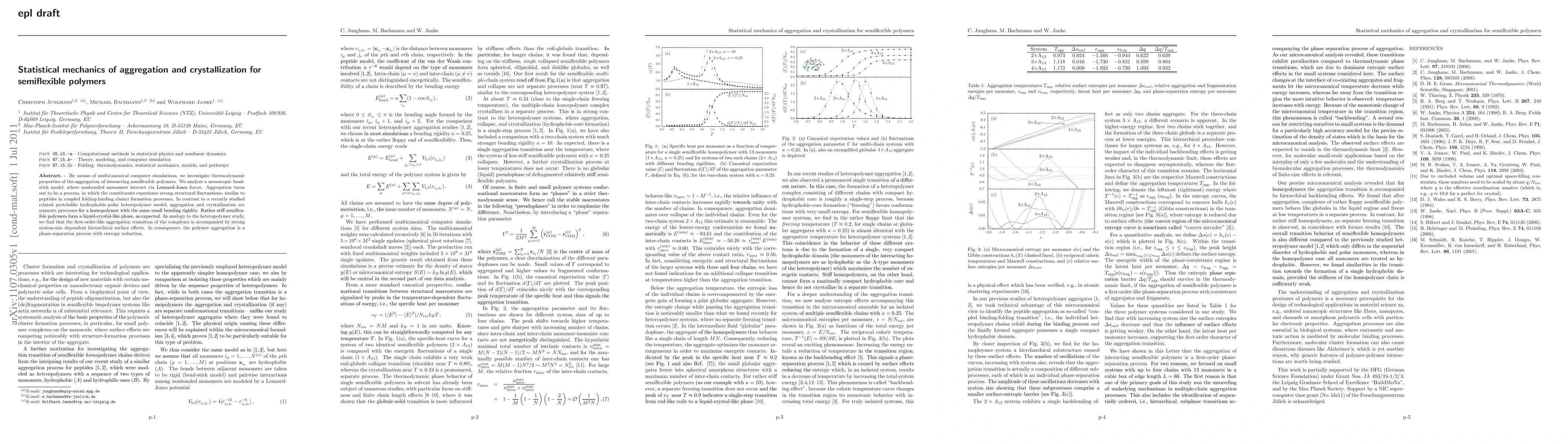 This paper uses multicanonical simulations to study the aggregation and crystallization of semiflexible polymers, revealing that these processes are distinct for homopolymers with small bending rigidity. The study finds that aggregation leads to a phase-separation process with significant structural fluctuations and entropy reduction, forming a liquid-crystal-like phase.