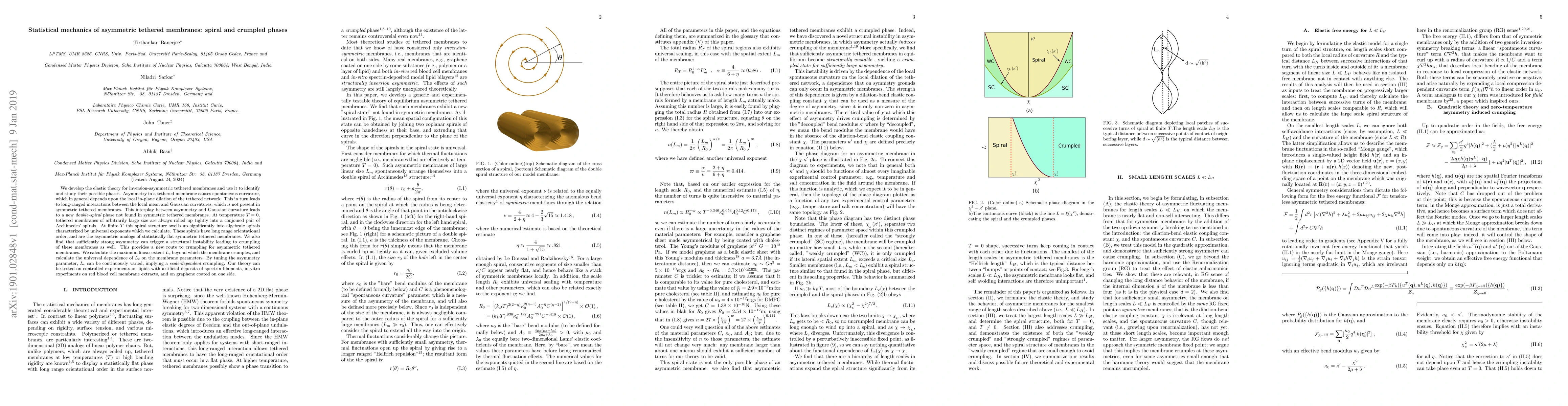 This paper develops an elastic theory for asymmetric tethered membranes, identifying new phases such as double-spiral and crumpled phases due to spontaneous curvature and long-range interactions. At low temperatures, membranes form tightly rolled spirals, while at finite temperatures, these spirals expand into algebraic spirals with long-range order. Strong asymmetry can also induce crumpling, with a scale-dependent transition determined by membrane parameters.