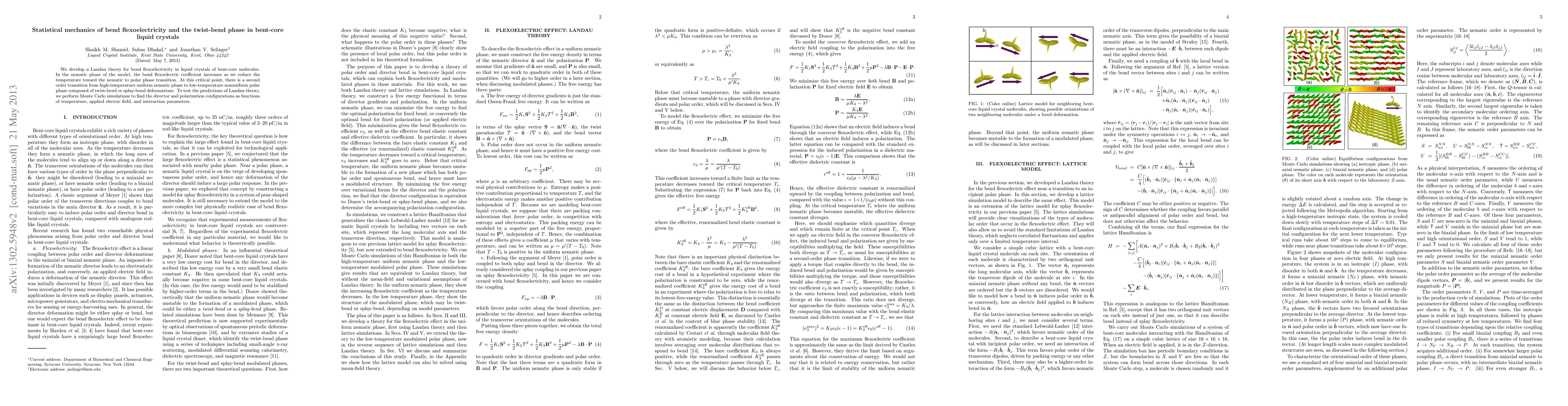 This paper develops a Landau theory for bend flexoelectricity in bent-core liquid crystals, predicting a second-order phase transition from a uniform nematic to a polar phase with twist-bend deformations. Monte Carlo simulations are used to validate the theory by examining the director and polarization configurations under varying conditions.