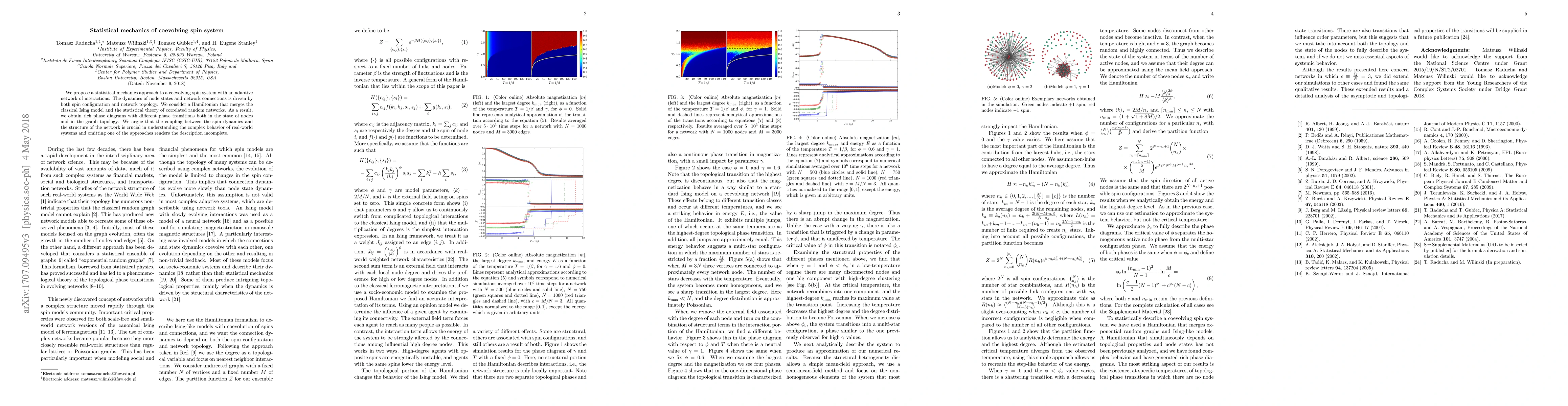 We propose a statistical mechanics approach to a coevolving spin system with an adaptive network of interactions. The dynamics of node states and network connections is driven by both spin configuration and network topology. We consider a Hamiltonian that merges the classical Ising model and the statistical theory of correlated random networks. As a result, we obtain rich phase diagrams with different phase transitions both in the state of nodes and in the graph topology. We argue that the coupling between the spin dynamics and the structure of the network is crucial in understanding the complex behavior of real-world systems and omitting one of the approaches renders the description incomplete.
