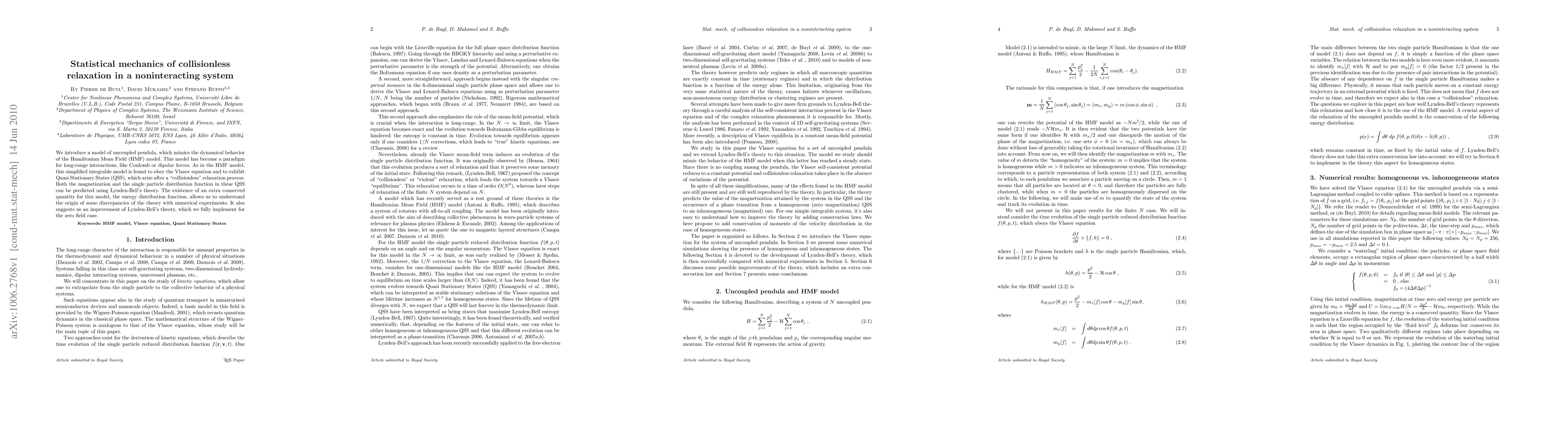 We introduce a model of uncoupled pendula, which mimics the dynamical behavior of the Hamiltonian Mean Field (HMF) model. This model has become a paradigm for long-range interactions, like Coulomb or dipolar forces. As in the HMF model, this simplified integrable model is found to obey the Vlasov equation and to exhibit Quasi Stationary States (QSS), which arise after a "collisionless" relaxation process. Both the magnetization and the single particle distribution function in these QSS can be predicted using Lynden-Bell's theory. The existence of an extra conserved quantity for this model, the energy distribution function, allows us to understand the origin of some discrepancies of the theory with numerical experiments. It also suggests us an improvement of Lynden-Bell's theory, which we fully implement for the zero field case.