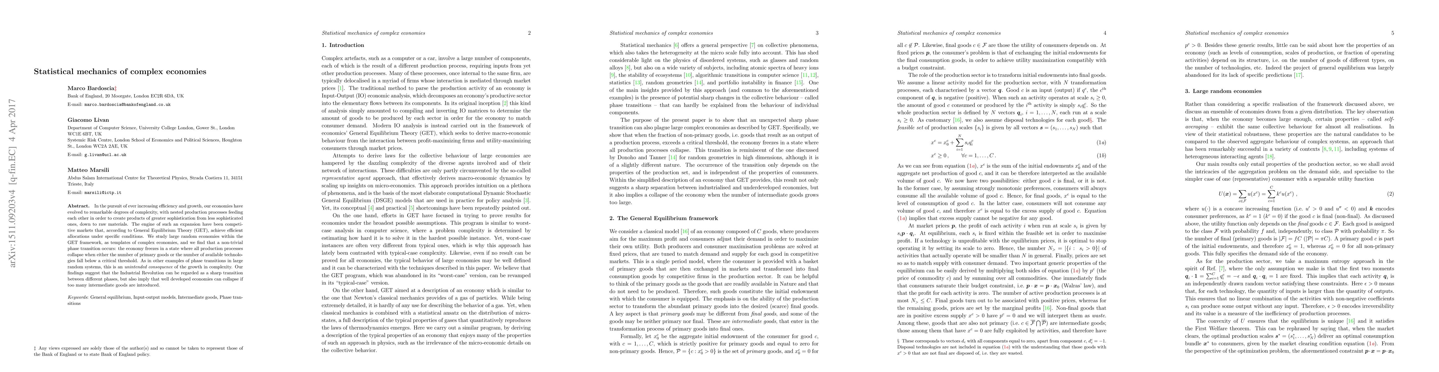 This paper investigates the statistical mechanics of complex economies within the General Equilibrium Theory framework, revealing a phase transition where economies collapse when the number of primary goods or technologies falls below a critical threshold, highlighting the risks of excessive complexity.