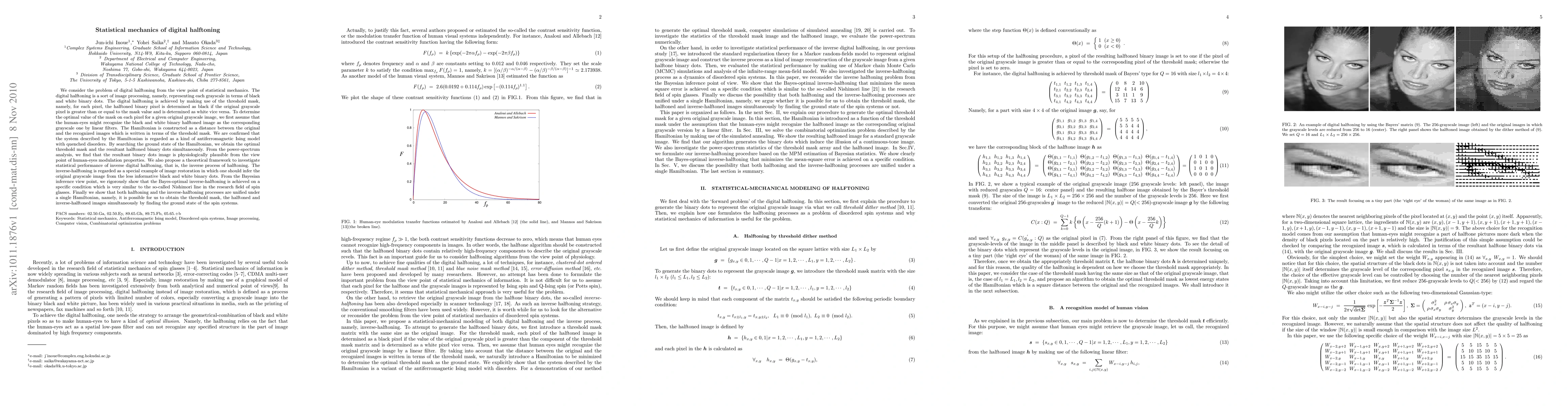 This paper applies statistical mechanics to digital halftoning, modeling the process as an antiferromagnetic Ising model to determine optimal threshold masks. The study finds that the resulting binary dot patterns align with human visual perception and proposes a theoretical framework for the statistical performance of inverse digital halftoning.