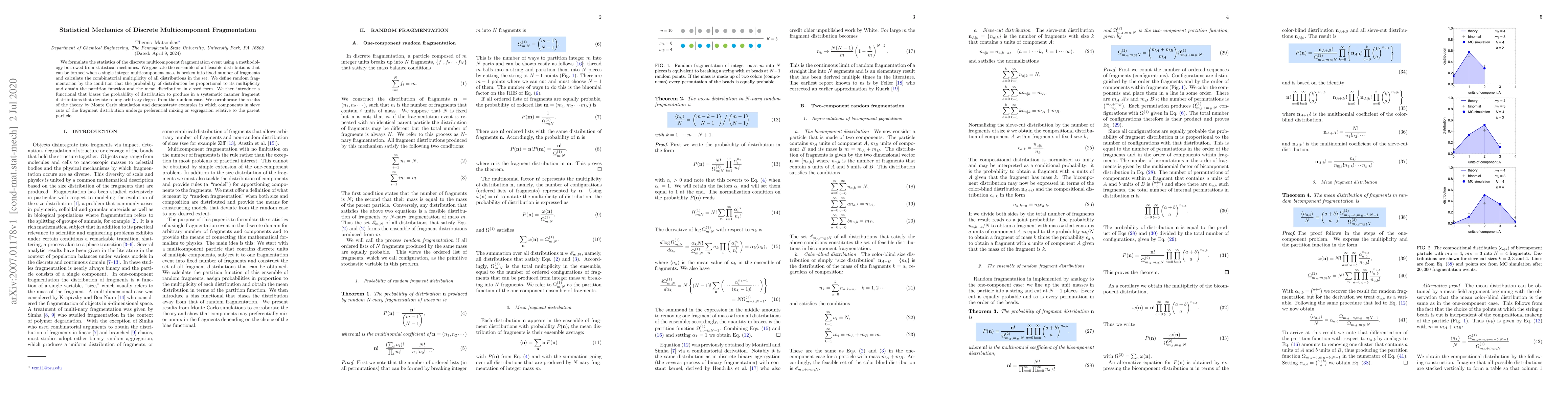 This paper formulates the statistical mechanics of discrete multicomponent fragmentation, deriving the ensemble of all possible distributions from a single integer mass broken into a fixed number of fragments. It introduces a functional to systematically bias fragment distributions and validates the theoretical results with Monte Carlo simulations, showing preferential mixing or segregation in fragment components.