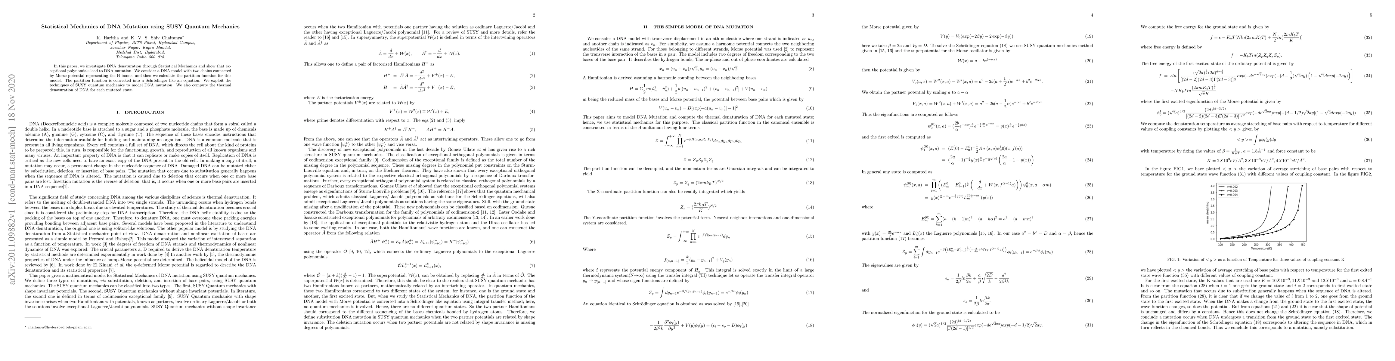 This paper employs statistical mechanics and SUSY quantum mechanics to model DNA mutation, demonstrating that exceptional polynomials are linked to DNA denaturation. It constructs a DNA model with two chains connected by Morse potential and calculates the partition function, converting it into a Schrödinger-like equation to study mutation and thermal denaturation.
