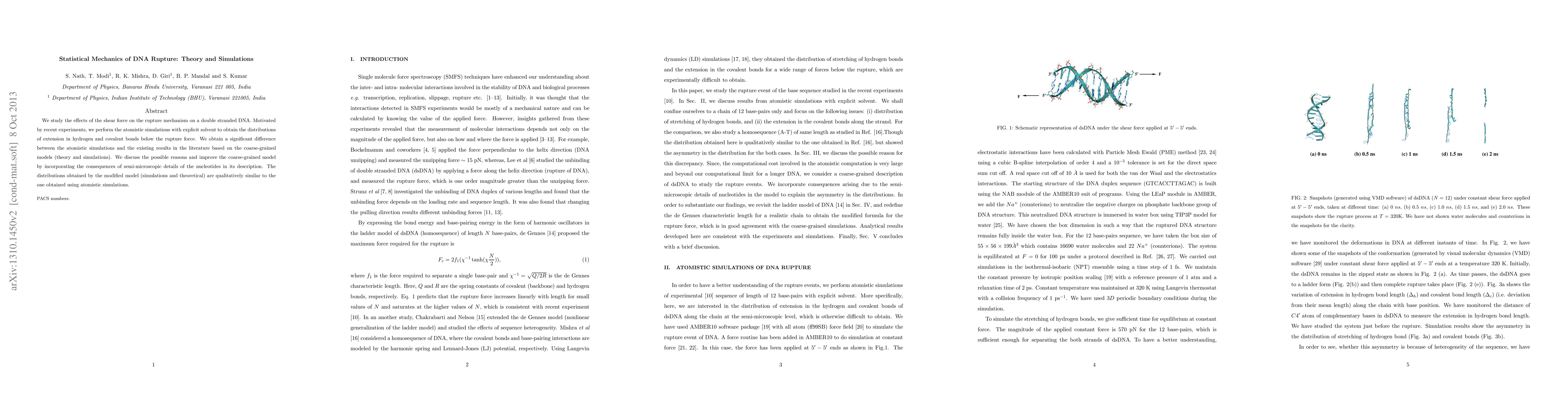 We study the effects of the shear force on the rupture mechanism on a double stranded DNA. Motivated by recent experiments, we perform the atomistic simulations with explicit solvent to obtain the distributions of extension in hydrogen and covalent bonds below the rupture force. We obtain a significant difference between the atomistic simulations and the existing results in the iterature based on the coarse-grained models (theory and simulations). We discuss the possible reasons and improve the coarse-grained model by incorporating the consequences of semi-microscopic details of the nucleotides in its description. The distributions obtained by the modified model (simulations and theoretical) are qualitatively similar to the one obtained using atomistic simulations.