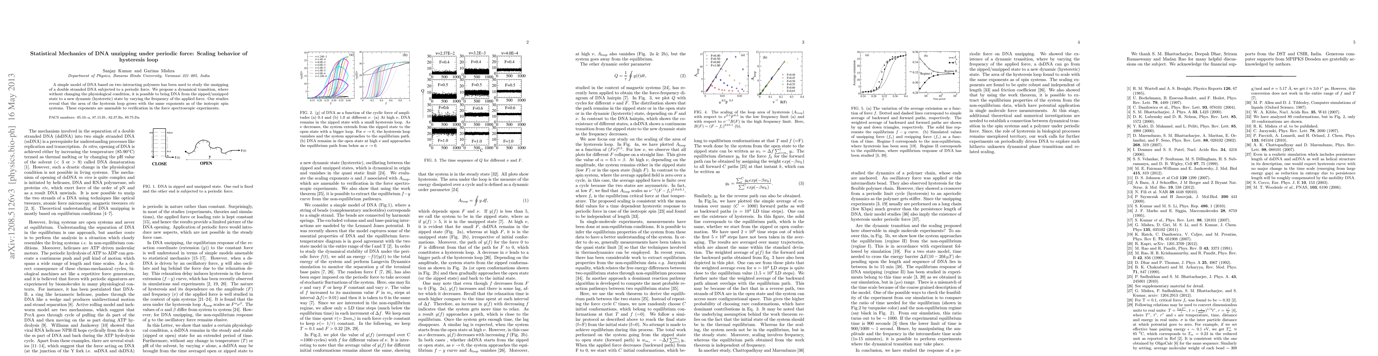 This paper investigates the statistical mechanics of DNA unzipping under periodic force, proposing a dynamical transition that alters the DNA state by varying force frequency. The study finds that the hysteresis loop area scales similarly to isotropic spin systems, with exponents potentially verifiable through force spectroscopic experiments.