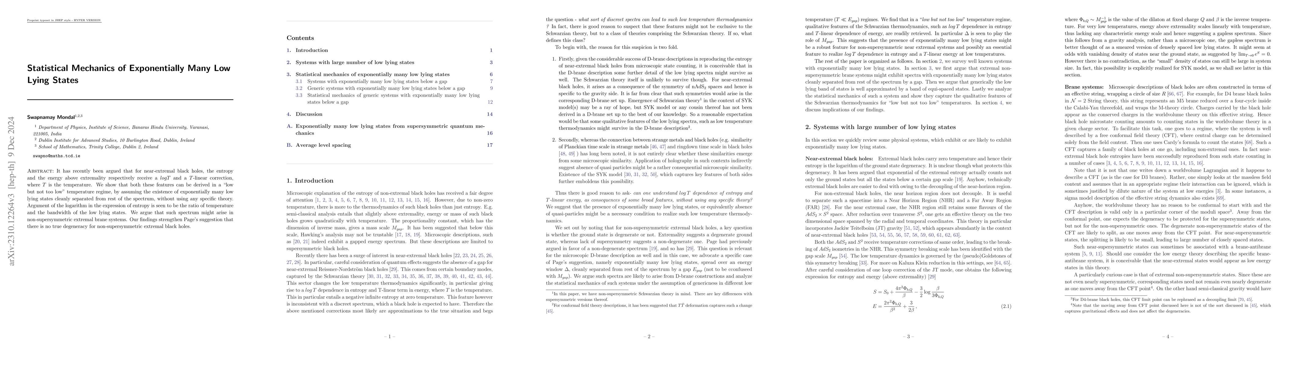 This paper demonstrates that near-extremal black hole entropy and energy corrections can be derived from the assumption of exponentially many low lying states, providing a general statistical mechanics framework without reliance on specific theoretical models. The findings suggest a "low but not too low" temperature regime where these corrections manifest.