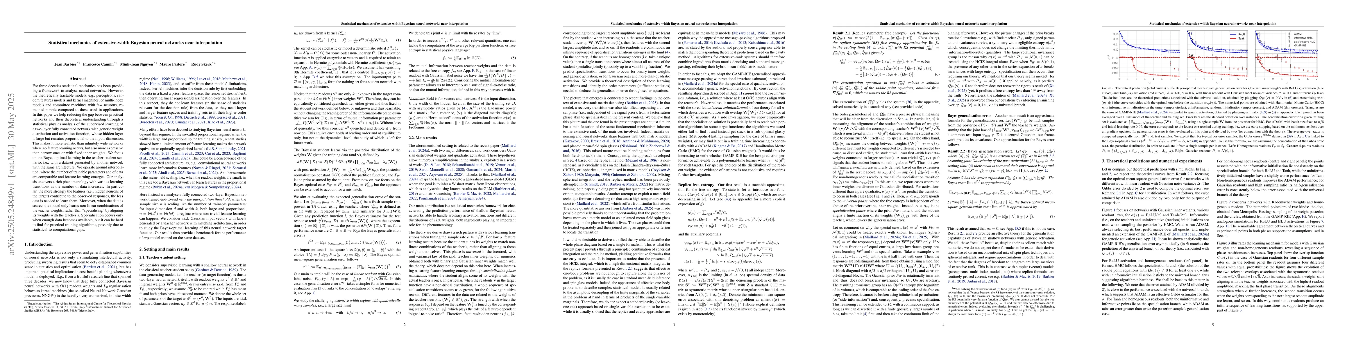 The research analyzes the statistical mechanics of extensive-width Bayesian neural networks near interpolation, focusing on the supervised learning of a two-layer fully connected network with a generic weight distribution and activation function, and a hidden layer proportional to the input dimension.