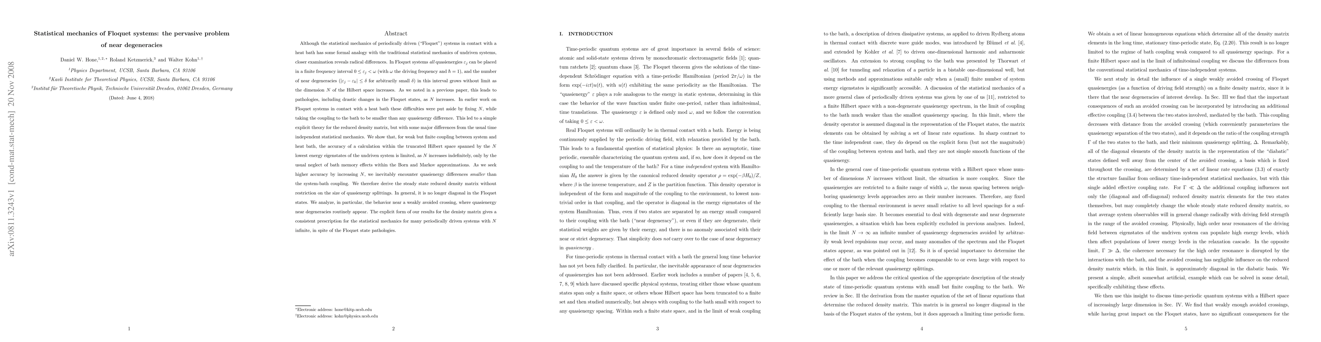 The statistical mechanics of periodically driven ("Floquet") systems in contact with a heat bath exhibits some radical differences from the traditional statistical mechanics of undriven systems. In Floquet systems all quasienergies can be placed in a finite frequency interval, and the number of near degeneracies in this interval grows without limit as the dimension N of the Hilbert space increases. This leads to pathologies, including drastic changes in the Floquet states, as N increases. In earlier work these difficulties were put aside by fixing N, while taking the coupling to the bath to be smaller than any quasienergy difference. This led to a simple explicit theory for the reduced density matrix, but with some major differences from the usual time independent statistical mechanics. We show that, for weak but finite coupling between system and heat bath, the accuracy of a calculation within the truncated Hilbert space spanned by the N lowest energy eigenstates of the undriven system is limited, as N increases indefinitely, only by the usual neglect of bath memory effects within the Born and Markov approximations. As we seek higher accuracy by increasing N, we inevitably encounter quasienergy differences smaller than the system-bath coupling. We therefore derive the steady state reduced density matrix without restriction on the size of quasienergy splittings. In general, it is no longer diagonal in the Floquet states. We analyze, in particular, the behavior near a weakly avoided crossing, where quasienergy near degeneracies routinely appear. The explicit form of our results for the denisty matrix gives a consistent prescription for the statistical mechanics for many periodically driven systems with N infinite, in spite of the Floquet state pathologies.