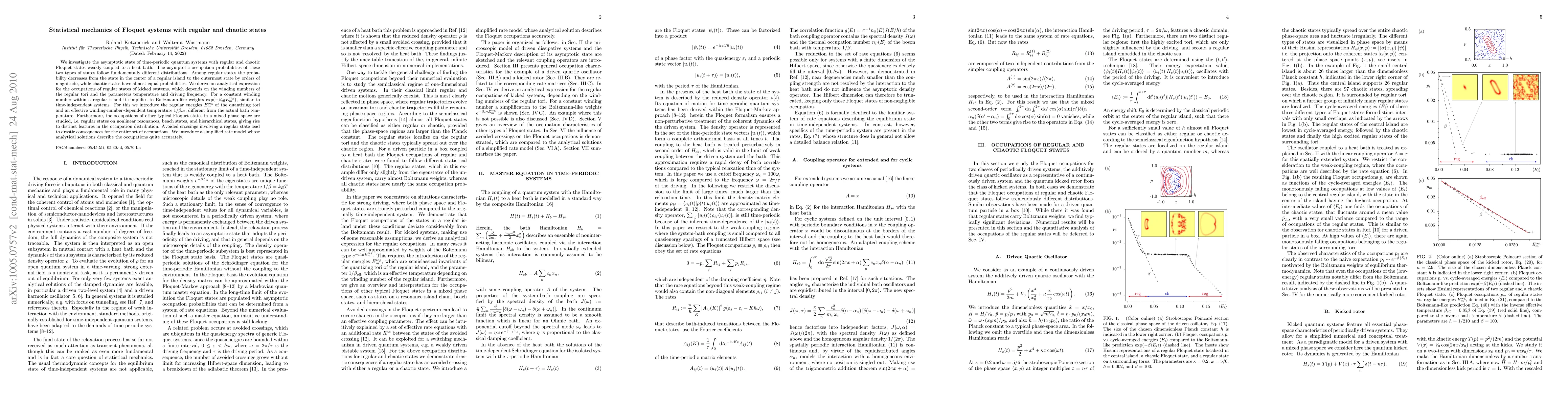 This research explores the behavior of time-periodic quantum systems with regular and chaotic states in contact with a heat bath. It reveals distinct occupation probability distributions for regular and chaotic states, with regular states showing a significant decrease from inner to outer island states, and chaotic states having nearly equal probabilities. An analytical expression for regular state occupations is derived, dependent on winding numbers, regular energies, and an effective temperature. The study also examines other Floquet states and introduces a simplified rate model that accurately describes occupation patterns.
